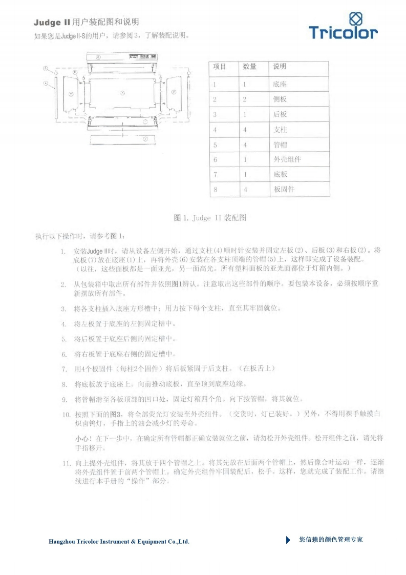 Xxrite③Tricolor部件号:424269文档版本:4.2-2006年7月Macbeth Judge®I和Macbeth Judge®Il-S操作手册Judge‖(便携式)和Judge-S(固定式)是用于在特定照明条件下进行颜色"8图国测定的灯箱。udg9I和Judge ll-S的功能:符合或超过公布的色彩视觉评定国际标准的平衡光线·运行计时器●“瞬间升温”功能可消除预热等待薄膜式键盘,可快速切换不同光源dgeI还提供了可选的背带式软尼龙罩。安全使用说明请仔细阅读并遵守下列说明一在安装或运行本设备前,请阅读并遵守全部说明。保留本手册以供将米参考之用一阅读完本手册后,请妥善放置手册以使他人使用设备时阅读或参考。遵守警告内容一请遵守本手册中提供的所有警告和安全措施。这样做可保障您与您的设备的安全。如果未按本手册指定的方式操作本设备,将削弱设备本身提供的保护功能。防水防潮一使用本设备时请保持电气安全。如果使用场所中可能因溅水或其它液体或不可控湿气而导致电击危险,请勿使用本设备。正确清洁一可用干净、不起毛的白布擦拭设备。请勿使用液体清洁剂或含蜡清洁剂,因为这些物质会发黄并影响设备反射比和光泽度。请使用蘸有温和肥皂水的湿布清洁外表面。仅使用合适电源一请对本设备使用合适的电源。此方面如有疑问,请参考设备背面的标签。不使用设备时,请拔掉电源插头。更换灯管前拔掉设备插头-更换灯管前务必拔掉设备插头。请勿使电路负荷过大一请勿使墙壁电源插座和延长电线负荷过大。否则可能会有火灾或电击危险。请定期检查所有电线,确保无损坏、破裂或缠绕。如果电线出现损坏或破损迹象,请立即更换。远离热源一请勿在热源如电暖炉、热调节器或其它发热器具旁使用本设备。雷雨天时禁止使用本设备一在雷雨天,请拔掉设备电源插头以避免产生电涌或电源波动,否则会对灯管和电路造成损坏。正确维修-除更换灯管外,请勿自行维修设备。如果未获授权而自行维修,设备担保将失效。如果使用时出现任何其它故障,请联系XRte技术服务部门。损坏维修一设备跌落或损坏、电子元件浸水或其它液体,或设备无法正常工作时,必须由具备维修资格的维修人员进行维修。Hangzhou Tricolor Instrument Equipment Co.,Ltd.您信赖的额色管理专家