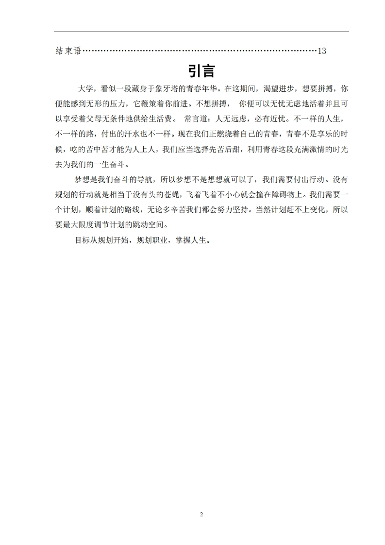 大学生职业生涯规划书_2348072@abc2个月前发布关注私信000大学生职业生涯规划书_2此内容为付费资源,请付费后查看¥16¥23黄金会员免费钻石会员免费立即购买您当前未登录!建议登陆后购买,可保存购买订单付费资源 第1页 / 共12页 第2页 / 共12页 试读已结束,还剩10页,您可下载完整版后进行离线阅读 © 版权声明文章版权归作者所有,未经允许请勿转载。THE END招生策划 文本预览 目录总论(引言)…3第一章认识自我个人基本情况…职业兴趣…职业能力…职业性格…职业价值观………5自我分析小结……5第二章环境分析家庭环境分析…5学校环境分析……社会环境分析……6职业环境分析…职业生涯条件分析小结……10第三章职业目标定位及其分解组合职业目标的确定……10职业目标的分解与组合……10第四章评估调整评估的内容………………12评估的时间……………12规划调整的原则………13 查看更多 收起部分 喜欢就支持一下吧点赞0 分享QQ空间微博QQ好友海报分享复制链接收藏