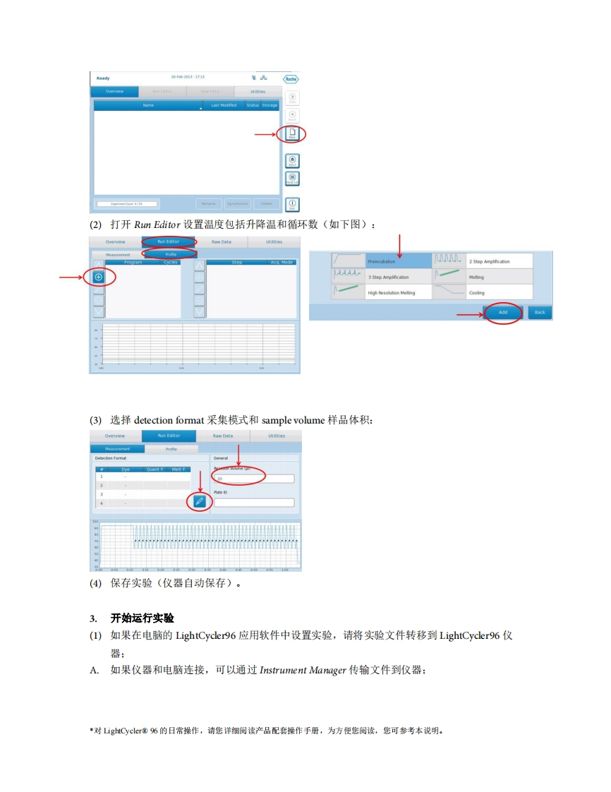 LightCycler96中文简易操作指南(仅供培训教育使用)说明:1.开机前请注意确保室温在15-32℃,仪器通风散热口不能有物品遮挡影响散热。2.请选用与罗氏原装耗材高度一致的96孔板或8联管。3.在操作过程中,切忌戴有粉末的乳胶手套或裸手接触光学透性封板膜或管盖。4.数据可以直接储存在仪器、电脑或者U盘,仪器最多可以储存50个实验数据需定时备份清理。按“s ynchronization”按钮仪器数据可以和U盘同步,U盘接口在LC96仪器右侧面上方,U盘支持热插拔,liux系统正常情况下无需担心病毒问题。5.仪器背后有两个USB接口,上面用于连接U盘,下面用于连Barcode,不要交换使用。6.实验完成后可以用U盘备份,或者传输到与之链接的电脑,或者以附件的形式发到指定邮箱。实验人员在离开PC扩增区时请带走用完的反应板,关闭仪器,电脑及总电源。具体操作流程l.打开仪器背面的电源开关,Initialization表示仪器开始初始化(期间不能运行试验,但已可设置程序),直到仪器界面左上角出现Readyl即为可用状态。ead26-2-17158品回日日日回电源开关回回2.设置实验程序(1)在LightCycler96应用软件,或者LightCycler96仪器软件创建实验程序(如左下图):*对LightCycler象96的日常操作,请您详细阅读产品配套操作手册,为方便您阅读,您可参考本说明.