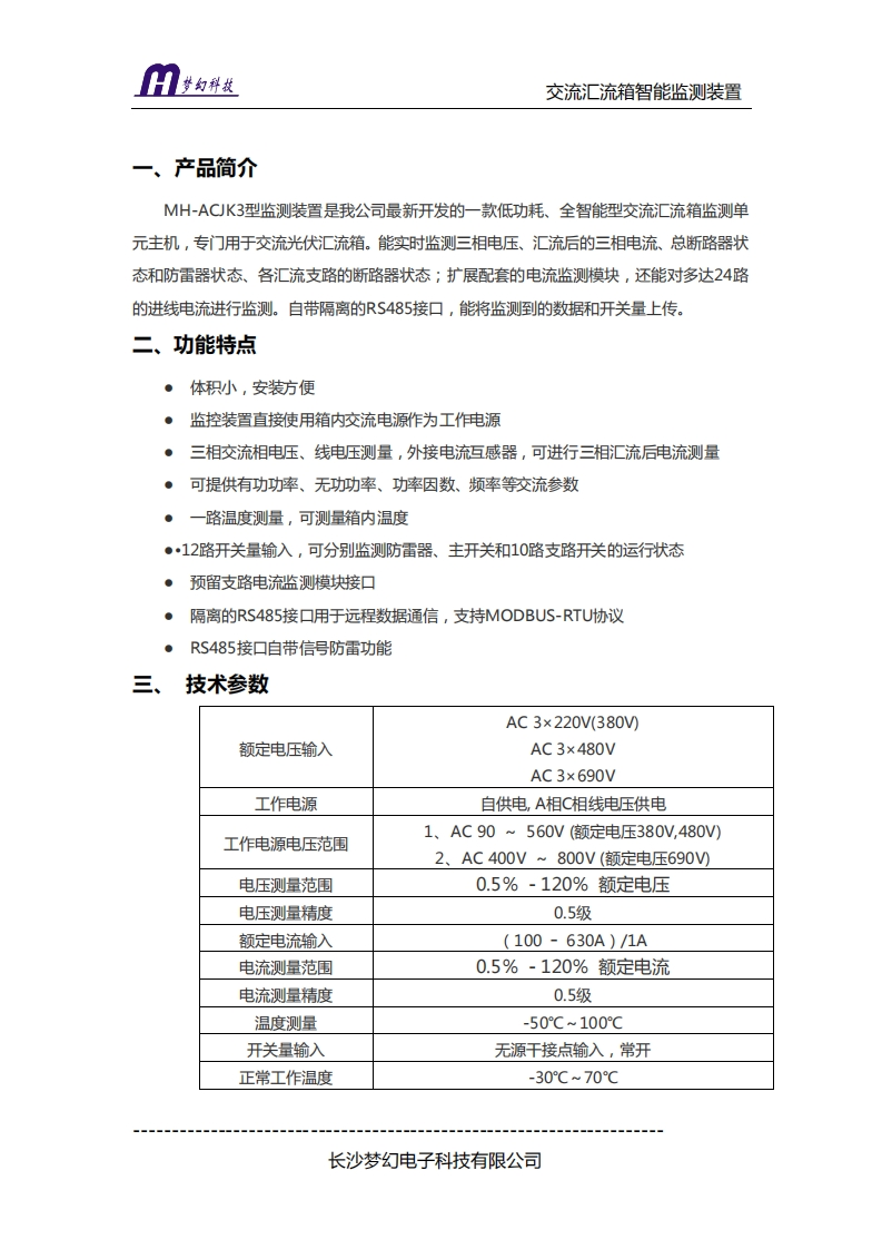 H梦约科发交流汇流箱智能监测装置MH-AC.JK3交流汇流箱智能监测装置使用说明书V1.02●三相四徒程定年正3日0W划生电压40WV-5三相三战顾定电压60WD112TD111RH上如4aD110UCMH-ACJK3D109光伏交流汇流箱D106D107UND106智能监控装置D105D104D103IA●RUND102●TxD101DI-G●RX485A1C*●然●PE485B长沙梦幻电子科技有限公司电话:0731-82739258/48传真:0731-82739248网站:http:/www.csmhkj.com长沙梦幻电子科技有限公司
