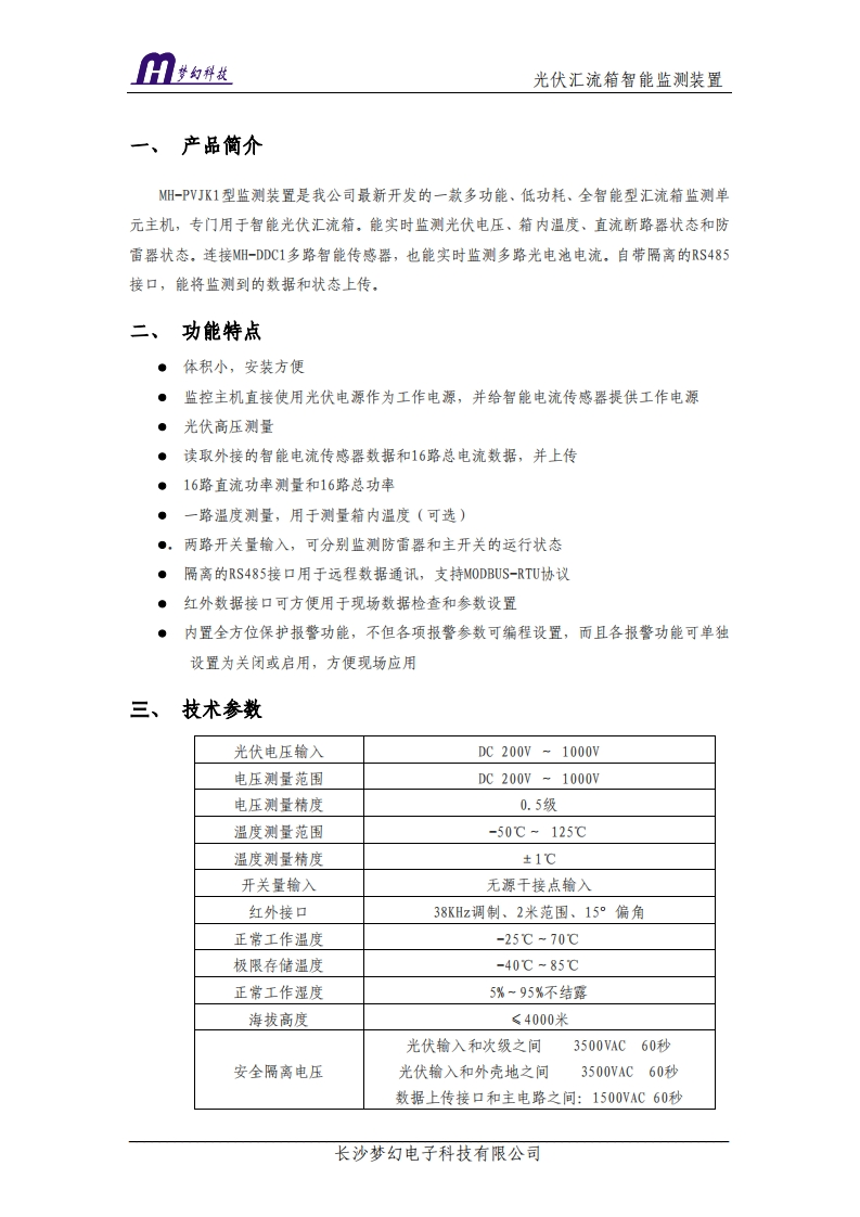 H¥均科发光伏汇流箱智能监测装置MH-PVJK1光伏汇流箱智能监测装置使用说明书V1.038(PV+200-1000VDCPV-MH-PVJK1H:4●●●●RUN ALM TX RX●咎●光伏汇流箱智能监测装置长沙梦幻电子科技有限公司指能传感器温度开关量输入上传9g9990900g999长沙梦幻电子科技有限公司电话:0731-82739258/48传真:0731-82739248网站:http:/www.csmhk j.con长沙梦幻电子科技有限公司