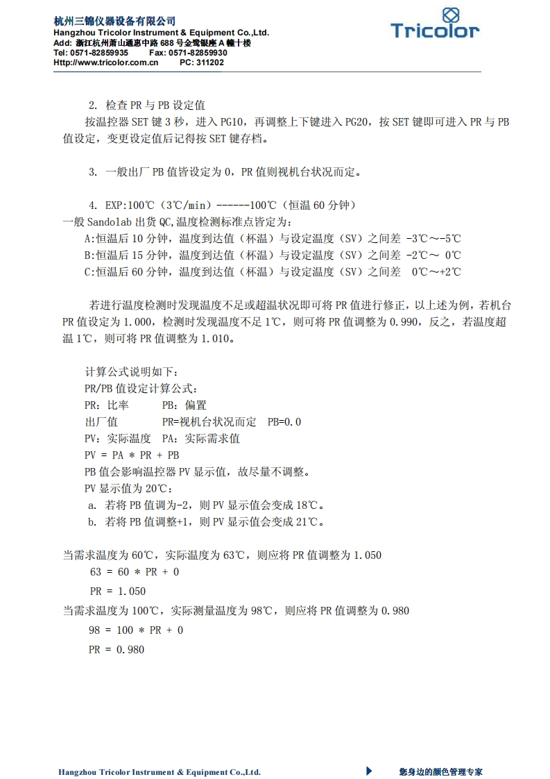 杭州三锦仪器设备有限公司Hangzhou Tricolor Instrument Equipment Co.,Ltd.Add:新江杭州萧山通惠中路688号金置银座A幢十楼TricolorTel:0571-82859935Fax:0571-82859930Http://www.tricolor.com.cn PC:311202宏益科技股份有限公司Sandolab(KC)温度校正步骤说明升温曲线校正:1.观察升温曲线是否正常,升温初期SV与PV间差较大,约五分钟后间差会越来越接近:恒温阶段时PV值会处于设定值与+0.6度间,若有异常请检查PID及鼓风机启动设定值。PID设定值:一般出厂设定值(360度机台)P1~P42·2.5·3·3.5I1~I4240·200·200·200D1-D460·50·50·50PID设定值:一般出厂设定值(45度机台)PID1PID44·160·45PID值会受环境温度所影响,若出厂设定值不适用于该环境,可进行PID自动演算。PS:按温控器SET键3秒,进入PG10,再调整上下键进入PG40~PG43,按SET键即可进入PID设定值调整,变更设定值后记得按SET键存档。PID设定值自动演算:先设定升温染程0~120℃/40分钟,将PB改为0,PR改为1:转盘满载,缸杯内大约放100cc的冷水:开始升温,当温度升至70℃前,按MODE2秒,显示ProG,再按一下MODE,显示PID,按↓AT灯亮起,开始自动演算(当AT灯熄灭时第一组自动演算即完成),这时不用管它,自动演算完成后会继续按染程设定运行下去,所以在90℃前/110℃前重复上面操作,即可完成第2/3组自动演算值,自动演算结束后,降温,做Sandolab测温,对测温的结果调节PB或PR值,即完成。鼓风机启动设定值:一般出厂设定值0.5度按温控器SET3秒,进入PG10,在调整上下键进入PG30,按SET键出现AL1,即可进入鼓风机启动设定值调整,变更设定值后记得按SET键存档。杯温设定:1.检测感温棒是否异常(表面附着导热砂,接触不良等)Hangzhou Tricolor Instrument Equipment Co.,Ltd.您身边的颜色管理专家
