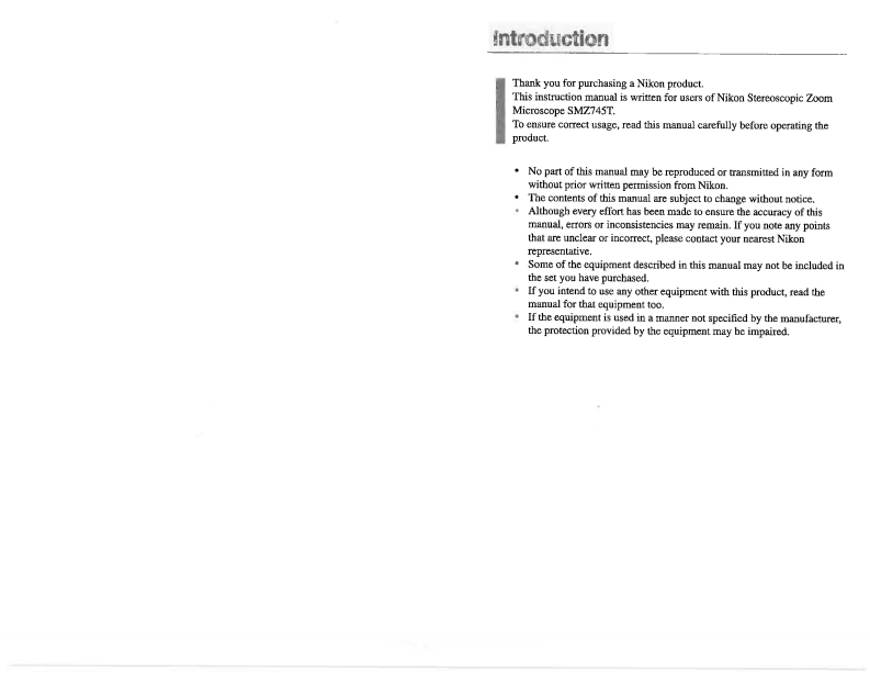 A:CROSCOPES AND IMAGING SOLUTIONSTechnicalInstrumentsM518E09.7.NR.1M518EN01NikonStereoscopic Zoom MicroscopeSMZ745TInstructions1826 Rollins Pocd,Burlingair.e,CA$4010-2215 (650)551-3000 Fcx (650)651-3001 ww.tec.hiast.com
