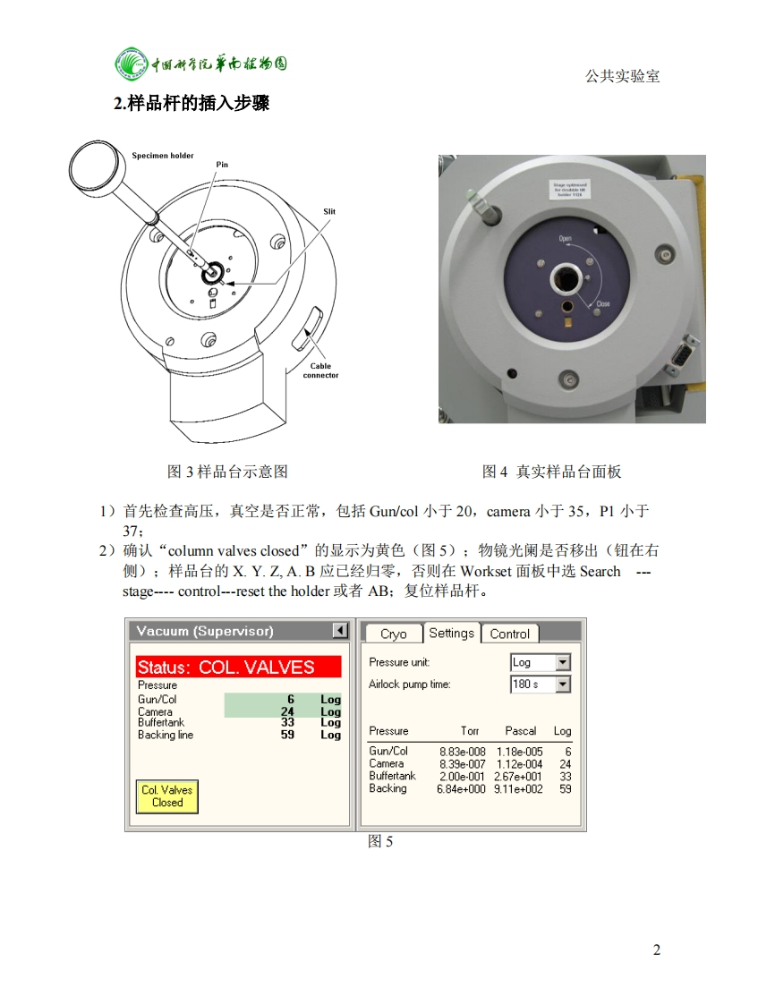 中圃前秀汽平市棍物国公共实验室Tecnai透射电子显微镜操作规程一样品及样品杆的安装1样品的安装1)将单倾样品杆(图1)放入有机玻璃管holder中,注意手不要接触样品杆前端位置:2)如图2所示,将针尖状Tool轻轻插入Spring Clamp尾部小孔中(注意一定要插到底,否则抬起时可能断裂针尖),并轻轻抬起,露出Specimen carrier;3)将样品正面朝下放入样品杆中心圆孔台中,然后轻轻放下SpringClamp;4)样品安装完成后需要用手轻敲样品杆黑色塑料尾端数次,确认样品位置无变化且无掉落的危险:5)取出样品时先用针尖Tool将Spring Clamp抬起后,可将镊子尖端插入tweezer notch,将样品取出。如果担心碰碎样品,可旋转样品杆180°,使样品自然掉下在干净的滤纸上。SpringTweezerclampnotch图1ToolSpringclampSpecimencarrier图21