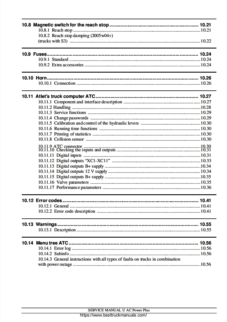 SERVICE MANUALMachine:U AC Power PlusManual No:005954Edition 2010AElectrical system10.1 Introduction..10.510.1.1 Component description....10.510.1.2 Safety10.5102 Battery.….10.710.2.1 Replace….10.710.2.2 Capacity measurement.10.810.2.3 Battery parameters from version 3.00.10.10103 Chassis...10.1110.3.1 Checking the ATC-chassis connection....10.1110.3.2 Potential measurement ..............10.1110.3.3 Optical aisle sensor,rail guidance..10.1210.3.4 Caster wheel rotation lock,UFS ...........10.1310.4 Connectors in cold storage rooms...........…10.1510.4.1 Greasing.10.1510.5 Drive and pump regulator (2005w04-)..10.1610.5.1 Dismantling,assembling .................10.1610.5.2 Designation.10.1610.5.3 General on control of the AC motors..10.1610.5.4C0 nnections…10.1610.5.5 Cable connections10.1710.5.6 Power cables.10.1710.6 Insulation resistance.……10.1810.6.1 Routine test…10.1810.7 Temperature measurement .......10.1910.7.1 Trouble shooting-hydraulic functions channels 3,4 and 5 ...............................10.20SERVICE MANUAL U AC Power Plushttps://www.besttruckmanuals.com/