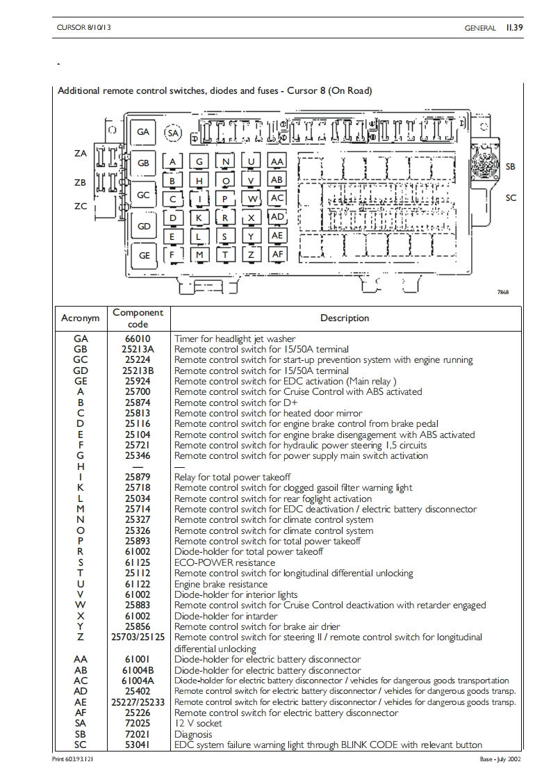 1.38GENERALCURSOR 8/I0/13Additional remote control switches,diodes and fuses-Cursor 8(Off Road)Cursor 10-Cursor 13GAZAGBSBD::门GDAEGEAF7858AcronymComponentcodeDescriptionGA66010Timer for headlight jet washer252I3ARemote control switch for 15/50A terminalGC25224Remote control switch for start-up prevention system with engine runningGD252I3BRemote control switch for 15/50A terminalGE25924Remote control switch for EDC activation (Main relayB25874Remote control switch for D+25813Remote control switch for heated door mimrorE25727Remote control switch for hydraulic power steering 1,5 circuits2572IRemote control switch for hydraulic power steering 1.5 circuits25346Remote control switch for power supply main switch activationH25879Relay for total power takeoffK25718Remote control switch for clogged gasoil filter waming light25034Remote control switch for rear foglight activation25714Remote control switch for EDC deactivation /electric battery disconnectorN25327Remote control switch for climate control system025326Remote control switch for climate control system25893Remote control switch for total power takeoffR61002Diode-holder for total power takeoff61125ECO-POWER resistance25713Remote control switch for longitudinal differential unlockingU61122Engine brake resistanceN25726Remote control switch for cross differential locking,front axle25128Remote control switch for cross differential unlocking,front axle25856Remote control switch for brake air drier'25703/25112Remote control switch for steering ll remote control switch for longitudinaldifferential unlockingAA61001Diode-holder for electric battery disconnectorAB61004BDiode-holder for electric battery disconnectorC61004ADiode-holder for electric battery disconnector/vehicles for dangerous goods transp.25402Remote control switch for electric battery disconnector/vehicles for dangerous goods transp.AE25227/25233Remote control switch for electric battery disconnector vehicles for dangerous goods transp.F25226Remote control switch for electric battery disconnector7202512 V socketSB7202IDiagnosisC53041EDC system failure warning light through BLINK CODE with relevant buttonBase-July 2007hmt603.93.21
