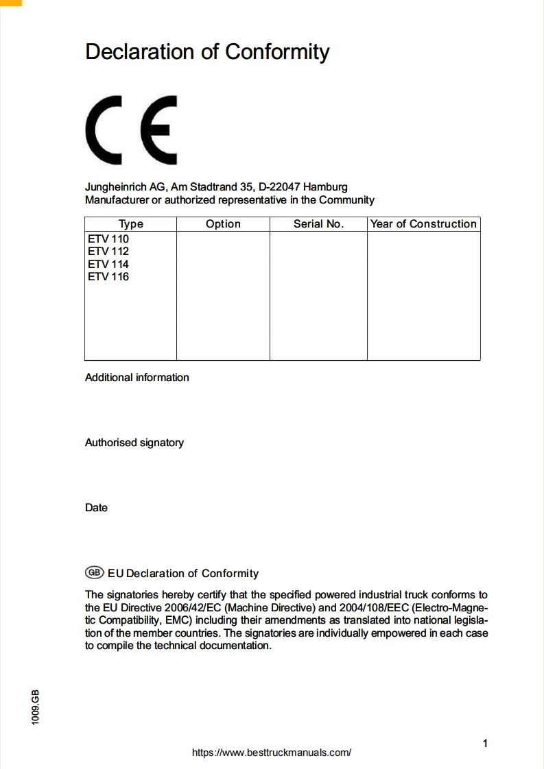 Jungheinrich-ETV-110-116-Stacker-Operating-Manual-PDF348072@abc16天前发布关注私信3.05MB157页024Jungheinrich-ETV-110-116-Stacker-Operating-Manual-PDF此内容为付费资源,请付费后查看¥49¥79黄金会员免费钻石会员免费立即购买您当前未登录!建议登陆后购买,可保存购买订单付费资源 第1页 / 共157页 第2页 / 共157页 试读已结束,还剩155页,您可下载完整版后进行离线阅读 THE END说明书手册 文本预览 ETV110-11612.05-GBOperating Instructions50468482ETV 11007.12ETV 112ETV114ETV 116JUNGHEINRICHMachines.Ideas.Solutions.https://www.besttruckmanuals.com/ 查看更多 收起部分 喜欢就支持一下吧收藏