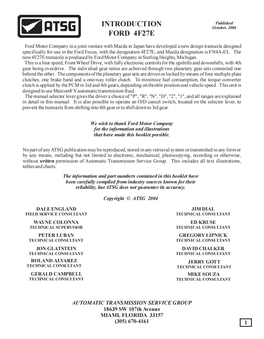 x济花济花济x器常常常常济器花器花常花常花常常花常常我ATSGFORD MOTOR CO.4F27E TRANSAXLEINDEXIDENTIFICATION TAG LOCATIONAND INFORMATION........3GENERALDESCRIPTION..TRANSAXLE INTERNAL COMPONENTAPPLICATION CHART.SHIFT SOLENOIDAPPLICATION CHARTAND IDENTIFICATIONTRANSAXLEINTERNAL COMPONENTRESISTANCE CHART..ELECTRICAL COMPONENT WIRE SCHEMATIC............GEAR RATIO IDENTIFICATION....ELECTRONIC COMPONENTDESCRIPTION.—入FAIL-SAFE OPERATION....4567899902gPCMLOCATIONAND PINIDENTIFICATION..TRANSAXLE RANGE SENSOR WIRE SCHEMATICDIAGNOSTIC TROUBLE CODE CHARTS...LINE PRESSURE TEST...56TRANSAXLE DISASSEMBLY.......COMPONENT REBUILD SECTIONOIL PUMP ASSEMBLY3FORWARD CLUTCH HOUSING ASSEMBLY7gREAR END COVER.DIRECT/REVERSE HOUSING DISASSEMBLEDIRECT CLUTCH HOUSINGASSEMBLY.....REVERSE CLUTCH HOUSING ASSEMBLY....拉好530PLANETARY GEAR ASSEMBLIES...........MANUAL CONTROL LINKAGE........SOLENOID BODYASSEMBLY........UPPERAND LOWER VALVE BODYASSEMBLIES.BEARING REPLACEMENTAND GEARSET-UP.TRANSAXLEASSEMBLY......INTERMEDIATE/OVERDRIVE BANDADJUSTMENTBOLTIDENTIFICATIONCHART.TORQUE SPECIFICATIONSAND FLUID REQUIREMENTS589013M294ESPECIAL TOOLREOUIREMENTSAND LISTEXPLODED TRANSAXLE VIEWS.AIR PRESSURE CHECKS....11AUTOMATIC TRANSMISSION SERVICE GROUP18639 SW 107TH AVENUEMIAMI,FLORIDA 33157(305670-4161Copyright©ATSG20042
