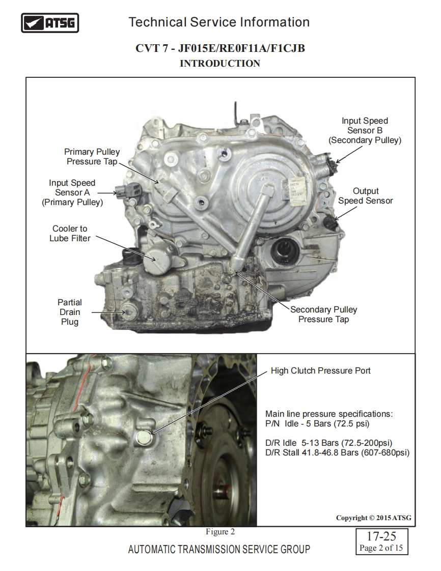 ATSGTechnical Service InformationCVT 7-JF015E/REOF11A/F1CJBINTRODUCTIONUn-tapped Pressure PortsTCC ReleaseTCC ApplyCooler In (H/E)Cooler Out(To filter)Rev.ClutchCopyright©2015ATSGFigure 117-25AUTOMATIC TRANSMISSION SERVICE GROUPPage 1 of 15
