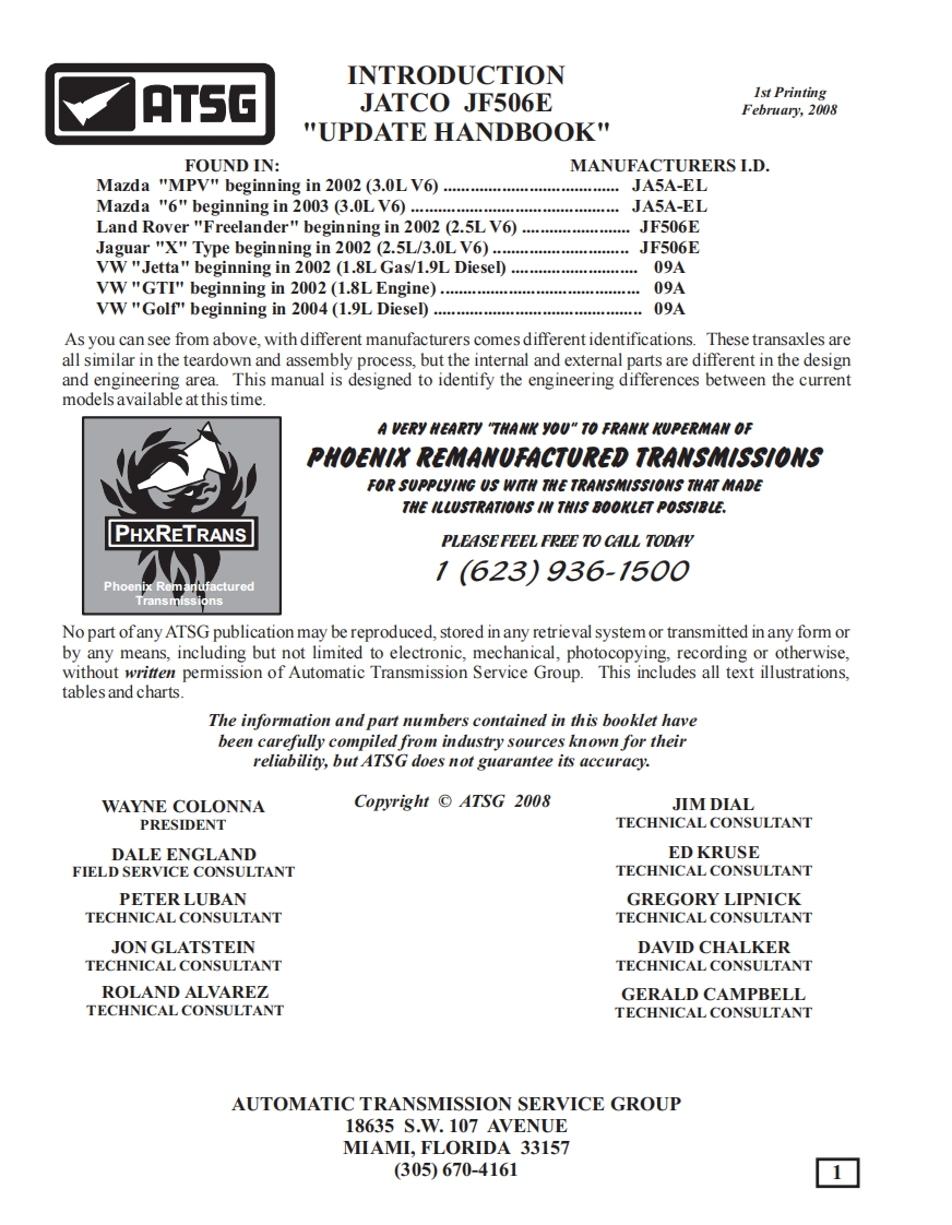 xxx济济署x济x济xxxx济济漫UPDATE HANDBOOKJF506EINDEXBELL HOUSINGIDENTIFICATION.......3CUT-AWAYAND INTERNAL COMPONENT LOCATIONS.COMPONENTAPPLICATION CHARTAND GEAR RATIOS....RANGE SELECTOR SWITCH CONNE CTOR IDENTIFICATION.456OIL PANIDENTIFICATION...14ELECTRONIC COMPONENTS,TERMINALIDENTIFICATION,WIRE SCHEMATICS.1INTERNALELECTRONICCOMPONENT LOCATIONSAND DIAGNOSIS...SOLENOID IDENTIFICATIONAND LOCATIONS....36DIA GNOSTICTROUBLE CODE DESCRIPTIONS...**VALVE BODYEXPLODED VIE WSAND CHECKBALL LOCATIONSSPACER PLATE DIFFERENCES...杨VALVE BODYCASTINGIDENTIFICATIONS.VALVE BODYTO CASE BOLT LOCATIONS..67VALVE BODYASSEMBLYPROCEDURE (FREELANDER)...FLUID REOUIREMENTS FOR ALLMODELSCHECKING FLUID AND FILLING PROCEDURES..........84NO RE VERSEAFTER REBUILD...7LINE PRESSURE TAPIDENTIFICATIONAND SPECIFICATIONS.OIL PUMPASSEMBLYINFORMATIONAND SPECIFICATIONS.REDUCTION BAND ADJUSTMENT...REDUCTION SERVO DIFFERENCES.......FLUID FILTER DIF FERENCES6OIL PUMP GASKET WARNING....INPUTSHAFTAND TRANSFER GEAR DIFFERENCES.DIF FERENTIALAND TRANSFER GEAR RATIO CHARTS BYMODEL....98FINAL DRIVE IDENTIFICATION.....2-3 FLARE OR SLIPS IN 3RD.4THAND 5TH.....100REPEATED LUBE FAILURE(VOLKSWAGENONLY...102DIRECT CLUTCH DIFFERENCES..104CASE PASSAGE IDENTIFICATION......107END COVERAND 2-4 BRAKE CLUTCH PISTON DIFFERENCES.108END COVER "V"-CUTSEALING RINGS...10gLOW ROLLER CLUTCHAND SNAPRINGINFORMATION110LOW/REVERSE CLUTCH INSTALLATIONINFORMATION.110LOW CLUTCH "STEPPED"SEALING RINGS......112DIRECT CLUTCH "STEPPED"SEALING RINGS.112AUTOMATIC TRANSMISSION SERVICE GROUP18639 S.W.107 AVENUEMIAMI,FLORIDA 33157(305670-4161Copyright©ATSG2008