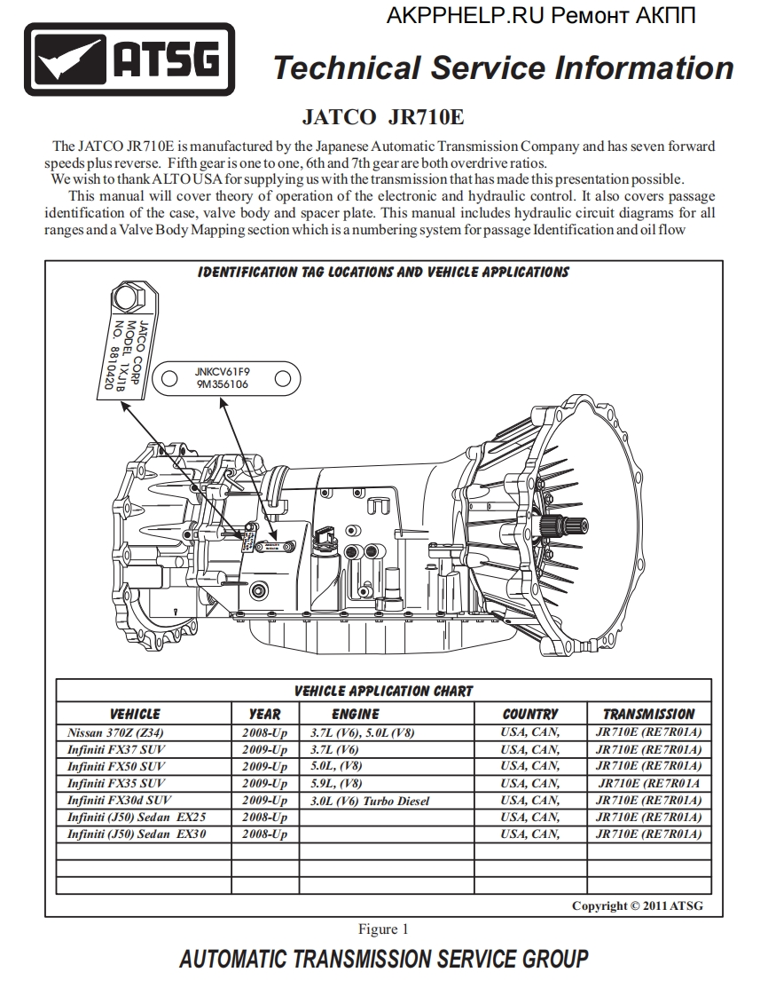 AKPPHELP.RU PeMOHT AKNNATSGTechnical Service InformationINDEXINDEXRefer to Page 3 Figure 2 for a Cross-sectional view and component identification chart.Refer to Page 4 Figure 3 for a case comparison to the RE5R05A.Refer to Page 5 Figure 4 for the Component application chart.Refer to Page 5 Figure 5 for the available gear ratios.Refer to Page 7 Figures 7 and 8 for the Solenoid location and TCM communication description.Refer to Page 8 Figure 9 for the Solenoid function chart.Refer to Page 9 Figures 10 and 11 for the Normally Applied and Normally Vented Solenoid description ofoperation.Refer to Page 10 Figure 12 for the Normally Closed Solenoid description of operation.Refer to Page 11 Figure 13 for TCM terminal identification and function.Refer to Page 12 Figures 14 and 15 for the Output Shaft Speed sensor location and description of operation.Refer to Page 13 Figure 16 for the internal electronic component locations.Refer to Page 14 Figure 17 for the internal TCM partial wire schematic.Refer to Page 15 Figure 18 for a list of diagnostic trouble codes.Refer to Page 16 Figure 19 for case passage identification.Refer to Page 17 Figure 20 for the front case and pump passage identification.Refer to Page 18 Figure 21-23 for the drum support,Direct and Low Brake passage identification.Refer to Page 19 Figure 24-25 for the FI and F2freewheel rotations.Refer to Pages 20-36 for the Valve Body exploded views and check ball locations and functions and assembly procedures.Refer to Page 37 Figure 49 for the Line Pressure Solenoid Theory of operation.Refer to Page 38 Figure 50 for the Torque Converter Clutch Solenoid Theory of operation.Refer to Page 39 Figure 51 for the Anti-Interlock Solenoid Theory of operation.Refer to Page 40 Figure 52 for the Front Brake Solenoid Theory of operation.Refer to Page 41 Figure 53 for the Low Brake Solenoid Theory of operation.Refer to Page 42 Figure 54 for the High and Low Reverse Clutch Solenoid Theory of operation.Refer to Page 43 Figure 55 for the Input Clutch Solenoid Theory of operation.Refer to Page 44 Figure 56for the 2346 Clutch Solenoid Theory of operation.Refer to Page 45 Figure 57 for the Direct Clutch Solenoid Theory of operation (4th gear example).Refer to Page 46 Figure 58 for the Direct Clutch Solenoid Theory of operation (5th gear example).VALVE BODY MAPPING:Refer to Page 47-53 for the Valve Body Mapping text (Passage I.D.)Refer to Page 55 for the Valve Body Mapping Oil circuit diagramOIL CIRCUIT DIAGRAMS:Refer to Page 56 for Park/NeutralRefer to Page 61 for Drive 4th GearRefer to Page 57 for ReverseRefer to Page 62 for Drive 5th GearRefer to Page 58 for Drive 1st gearRefer to Page 63 for Drive 6th GearRefer to Page 59 for Drive 2nd GearRefer to Page 64 for Drive 7th GearRefer to Page 60 for Drive 3nd GearRefer to Page 65 for Drive 7th Gear TCC ONAUTOMATIC TRANSMISSION SERVICE GROUP