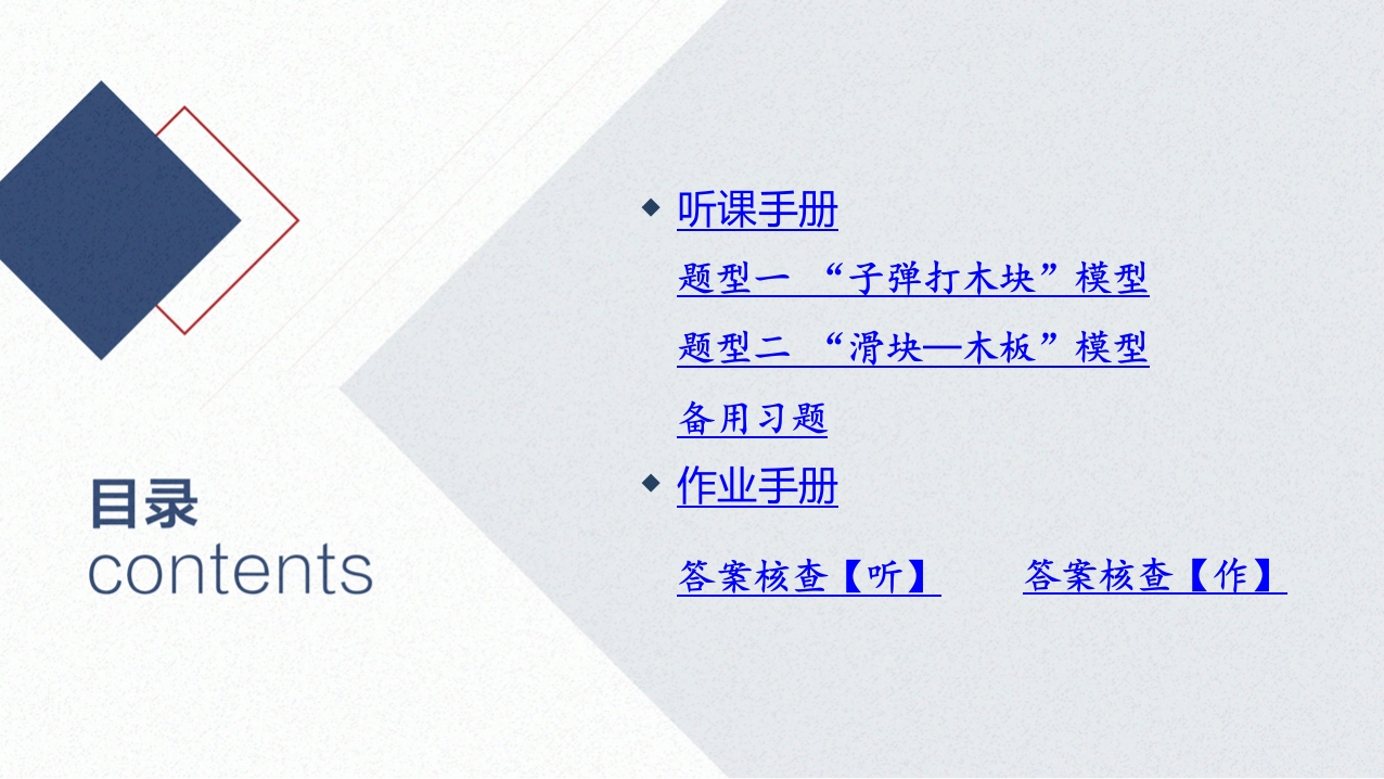 03-专题九“子弹打木块”模型和“滑块—木板”模型348072@abc9天前发布关注私信20.18MB84页03303-专题九“子弹打木块”模型和“滑块—木板”模型此内容为付费资源,请付费后查看¥9¥20黄金会员免费钻石会员免费立即购买您当前未登录!建议登陆后购买,可保存购买订单付费资源 第1页 / 共84页 第2页 / 共84页 试读已结束,还剩82页,您可下载完整版后进行离线阅读 THE END初中教育高中教育 文本预览 全品CANPOINT专题九“子弹打木块”模型和“滑块一木板”模型 查看更多 收起部分 喜欢就支持一下吧收藏