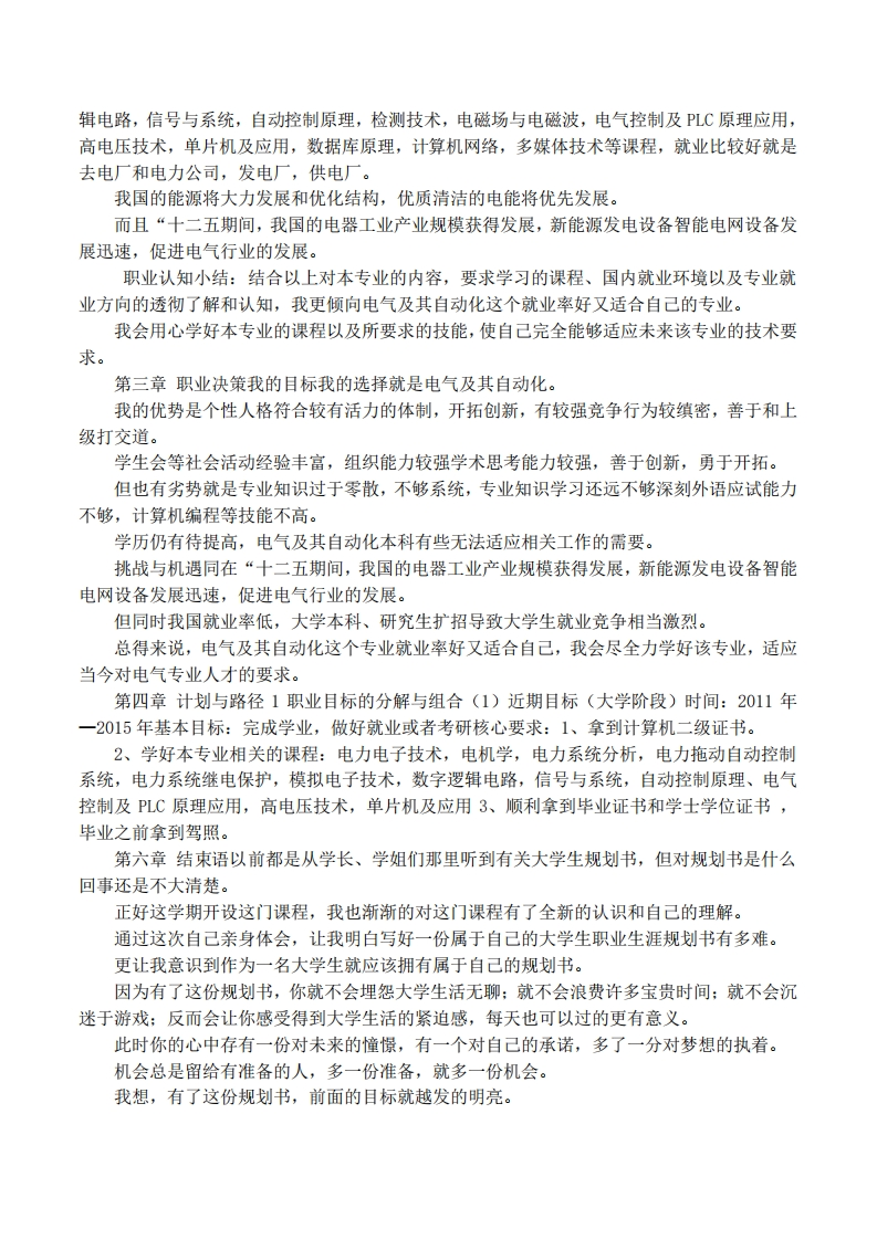 电力系统及其自动化大学生职业生涯规划书范文第一章自我认知1自我认知:优点:开朗、责任心事业心强、积极进取、学习性强、有上进心、有较强的管理能力、善良创新意识强、热爱运动、有幽默感、喜欢看书中、不够执着、爱玩手机、懒惰2家庭环境评价家住青海省西宁市湟中县李家山镇卡约村,我爸妈在家是农民,因家里有两个大学生,经济收入勉强还过得去。父亲是小学毕业生,家庭文化程度很落后。3职业分析(1)职业兴趣:倾向实践操作,管理,喜欢领导别人,能控制形势,户外工作、(2)性格特征:喜爱运动、活泼好动、朝气蓬勃、随和、平易近人、乐观亲切、意志力不够坚定、换位思考、(3)职业价值观:我的职业价值观是自由型、志愿型。工作不愿受人指使、干涉,但我不懂会积极请教人的。凭自己的能力做出属于自己的事业。我更会把默默帮助不幸的人视为无比的快乐,再者,国家利益重于一切!(4)职业能力:有动手能力、分析综合和辨认、视觉理解能力、逻辑推理、概括能力。不善于抽象、理论性强、判断理解力差。自我分析小结:结合我的职业兴趣、性格、价值观以及能力我认为自己对未来的职业的工作性质和内容会有更好的适应和理解,充分发挥自身的优点开创自己的事业。但我有时在日常学习生活中有所懈怠和迷茫,没有尽自己的主观能动性去了解专业知识。爱看跟学习无关的书籍,爱玩游戏,在学习上所花的时间甚少。但我会积极调整,把更多的精力和时间花在学习上第二章职业认知1整体、职业就业环境:尽管我国大学生就业形势严竣,人才竞争激烈以及对人才的高要求,失业率居高不下。但电气专业研究范围广,应用前景乐观,毕业生就业形势比较好。如果经过研究生的学习,可选择的就业机会大大提高。电气专业毕业生具有“点多、面宽、适应强电气专业毕业生能够在电气工程相关的系统运行、自动控制、电子电力技术、信息处理、研制开发、经济管理以及电子与计算机技术等领域担任重要工作,也能到发电厂、供电局、电网调度、各类大、中型企业从事电力设计、建设生产运行管理、市场运营、科技开发等工作。因此电气毕业生就业形势一片大好!2学校环境及专业就业方向分析:我现就读于青海大学,本校不仅是一所综合性的一本211重点大学。而且学校教学设施齐全,设备较先进,教学水平高,教师富有责任心,师资雄厚,教学质量高。电气专业是青海大学重点专业,电气基础课程安排合理,有助于学生学好专业知识。而且学校经常进行实习实践,增强学生对专业的认识以及提高学生动手的能力。往届毕业生的就业率达到百分百。所以学校的整体环境很好。学,电力系统分析,电力拖动自动控制系统,电力系统继电保护,模拟电子技术,数字逻