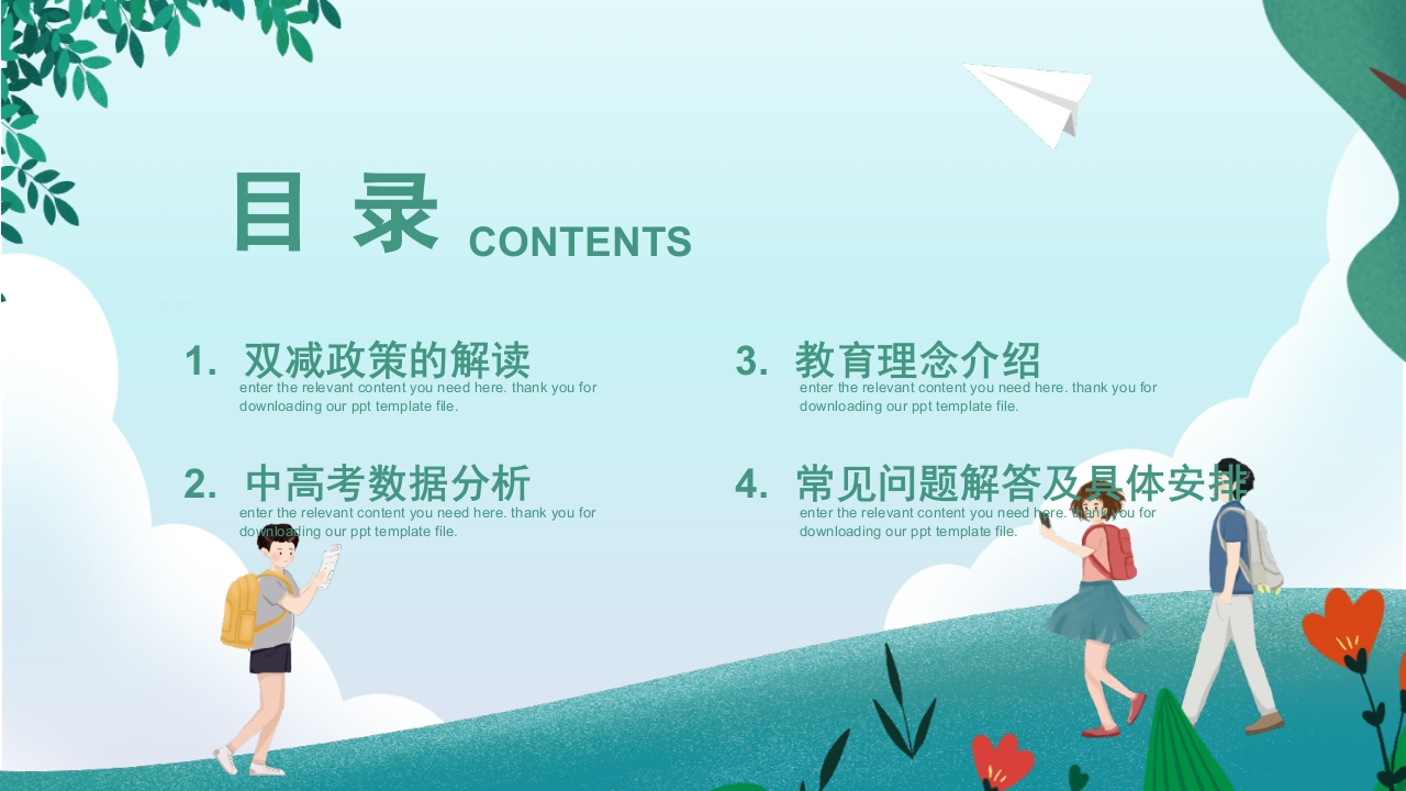解读《关于进一步减轻义务教育阶段学生作业负担和校外培训负担的意见》双减政策家长说明会Your content is entered here,or by copying your text,select Paste in this box and choose to retain only text.Your content is typedhere,or by copying your text,select Paste in this box.落实双减全面减负