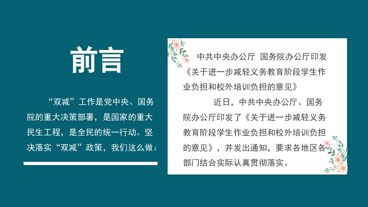 双减我们怎么做-02348072@abc昨天发布关注私信8.40MB23页048双减我们怎么做-02此内容为付费资源,请付费后查看¥9¥20黄金会员免费钻石会员免费立即购买您当前未登录!建议登陆后购买,可保存购买订单付费资源 第1页 / 共23页 第2页 / 共23页 试读已结束,还剩21页,您可下载完整版后进行离线阅读 THE END初中教育小学教育高中教育 文本预览 “双减”我们怎么做?教育部门“双减”政策宣讲培训会"ShuangJian"what do we do?●汇报人:●时间:202X.X.X 查看更多 收起部分 喜欢就支持一下吧收藏