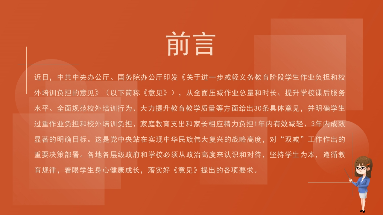 双减知识讲座课件-03348072@abc昨天发布关注私信14.35MB32页039双减知识讲座课件-03此内容为付费资源,请付费后查看¥9¥20黄金会员免费钻石会员免费立即购买您当前未登录!建议登陆后购买,可保存购买订单付费资源 第1页 / 共32页 第2页 / 共32页 试读已结束,还剩30页,您可下载完整版后进行离线阅读 THE END初中教育小学教育高中教育 文本预览 关于双减中央《意见》都讲了什么?重点解析《关于进一步减轻义务教育阶段学生作业负担和校外培训负担的意见》汇报人:XXX日期 查看更多 收起部分 喜欢就支持一下吧收藏