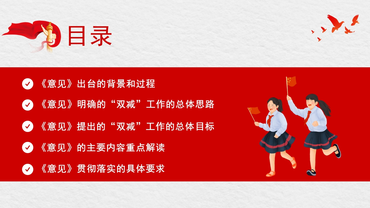 双减知识讲座课件-05348072@abc昨天发布关注私信32.04MB32页035双减知识讲座课件-05此内容为付费资源,请付费后查看¥9¥20黄金会员免费钻石会员免费立即购买您当前未登录!建议登陆后购买,可保存购买订单付费资源 第1页 / 共32页 第2页 / 共32页 试读已结束,还剩30页,您可下载完整版后进行离线阅读 THE END初中教育小学教育高中教育 文本预览 坚决贯彻中央决策部署深入推进“双减”工作减轻义务教育阶段学生作业负担和校外培训负担学习《关于进一步减轻义务教育阶段学生作业负担和校外培训负担的意见》重点内容讲解人:XXX时间 查看更多 收起部分 喜欢就支持一下吧收藏
