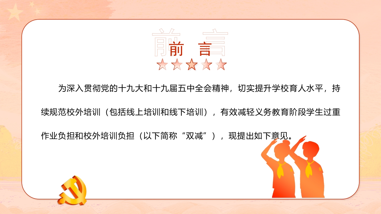 双减知识讲座课件-06348072@abc昨天发布关注私信19.52MB46页030双减知识讲座课件-06此内容为付费资源,请付费后查看¥9¥20黄金会员免费钻石会员免费立即购买您当前未登录!建议登陆后购买,可保存购买订单付费资源 第1页 / 共46页 第2页 / 共46页 试读已结束,还剩44页,您可下载完整版后进行离线阅读 THE END初中教育小学教育高中教育 文本预览 关于·进一步减轻义务教育阶段学生作业负担和校外培训负担的意见主讲人:09有效减轻义务教育阶段学生过重作业负担和校外培训负担 查看更多 收起部分 喜欢就支持一下吧收藏