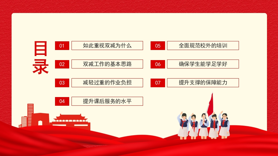 双减知识讲座课件-09348072@abc昨天发布关注私信5.47MB21页045双减知识讲座课件-09此内容为付费资源,请付费后查看¥9¥20黄金会员免费钻石会员免费立即购买您当前未登录!建议登陆后购买,可保存购买订单付费资源 第1页 / 共21页 第2页 / 共21页 试读已结束,还剩19页,您可下载完整版后进行离线阅读 THE END初中教育小学教育高中教育 文本预览 关于双减重点解析《关于进一步减轻义务教育阶段学生作业负担和校外培训负担的意见》关于进一步减轻义务教育阶段学生作业负担和校外培训负担的意见opinions on further reducing students'homework burden and after-school trainingburden stage of compul sory education宣讲人:某某某时间:20XX.XX 查看更多 收起部分 喜欢就支持一下吧收藏