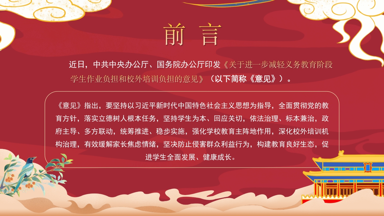 双减知识讲座课件-10348072@abc昨天发布关注私信15.63MB38页037双减知识讲座课件-10此内容为付费资源,请付费后查看¥9¥20黄金会员免费钻石会员免费立即购买您当前未登录!建议登陆后购买,可保存购买订单付费资源 第1页 / 共38页 第2页 / 共38页 试读已结束,还剩36页,您可下载完整版后进行离线阅读 THE END初中教育小学教育高中教育 文本预览 减少作业总量减轻家长负担提升课堂教学质量降低考试压力解读《教育双减》意见>关于进一步减轻义务教育阶段学生作业负担和校外培训负担的意见Opinions on further reducing students'homework burden and after-schooltraining burden at the stage of compulsory education 查看更多 收起部分 喜欢就支持一下吧收藏