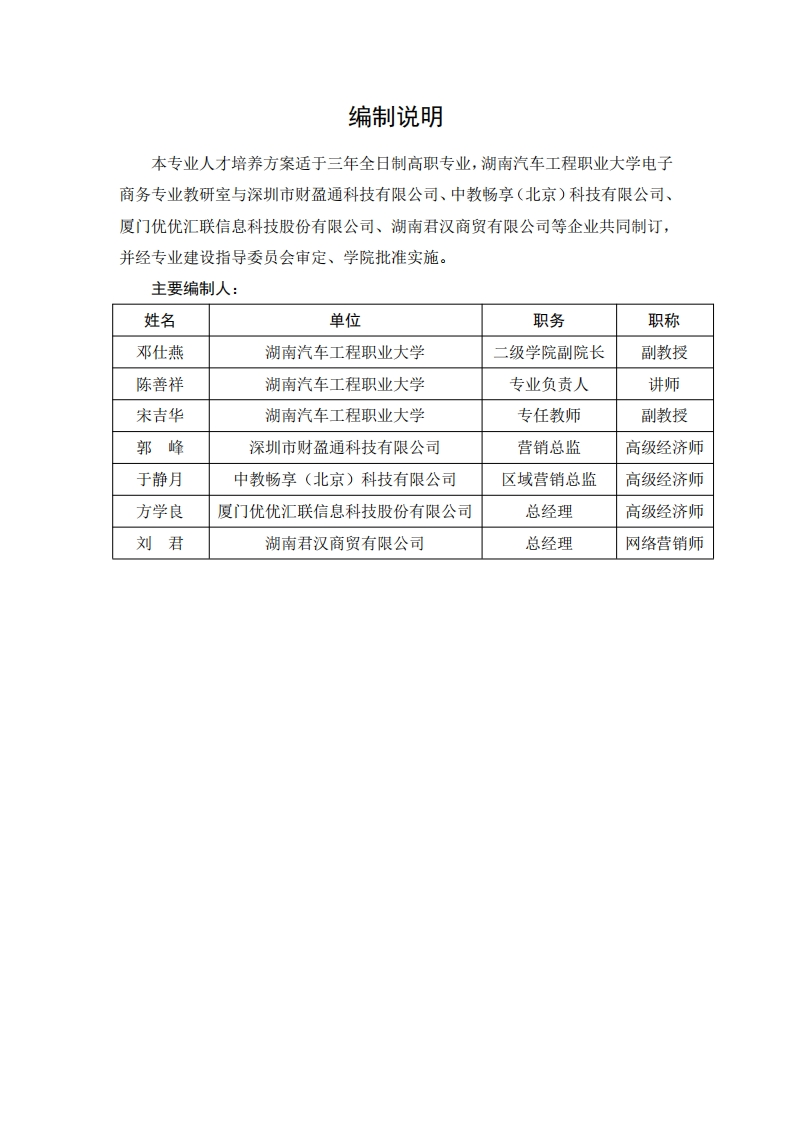 电子商务专业人才培养方案348072@abc3个月前发布关注私信2.39MB89页036电子商务专业人才培养方案此内容为付费资源,请付费后查看¥13¥23黄金会员免费钻石会员免费立即购买您当前未登录!建议登陆后购买,可保存购买订单付费资源 第1页 / 共89页 第2页 / 共89页 试读已结束,还剩87页,您可下载完整版后进行离线阅读 THE END招生策划 文本预览 愈烟有汽事上行陈常大学HUNAN AUTOMOTIVE ENGINEERING VOCATIONAL UNIVERSITY电子商务专业人才培养方案专业名称:电子商务专业代码:530701适用年级:2024级专业负责人:陈善祥制订时间:2024年6月 查看更多 收起部分 喜欢就支持一下吧收藏