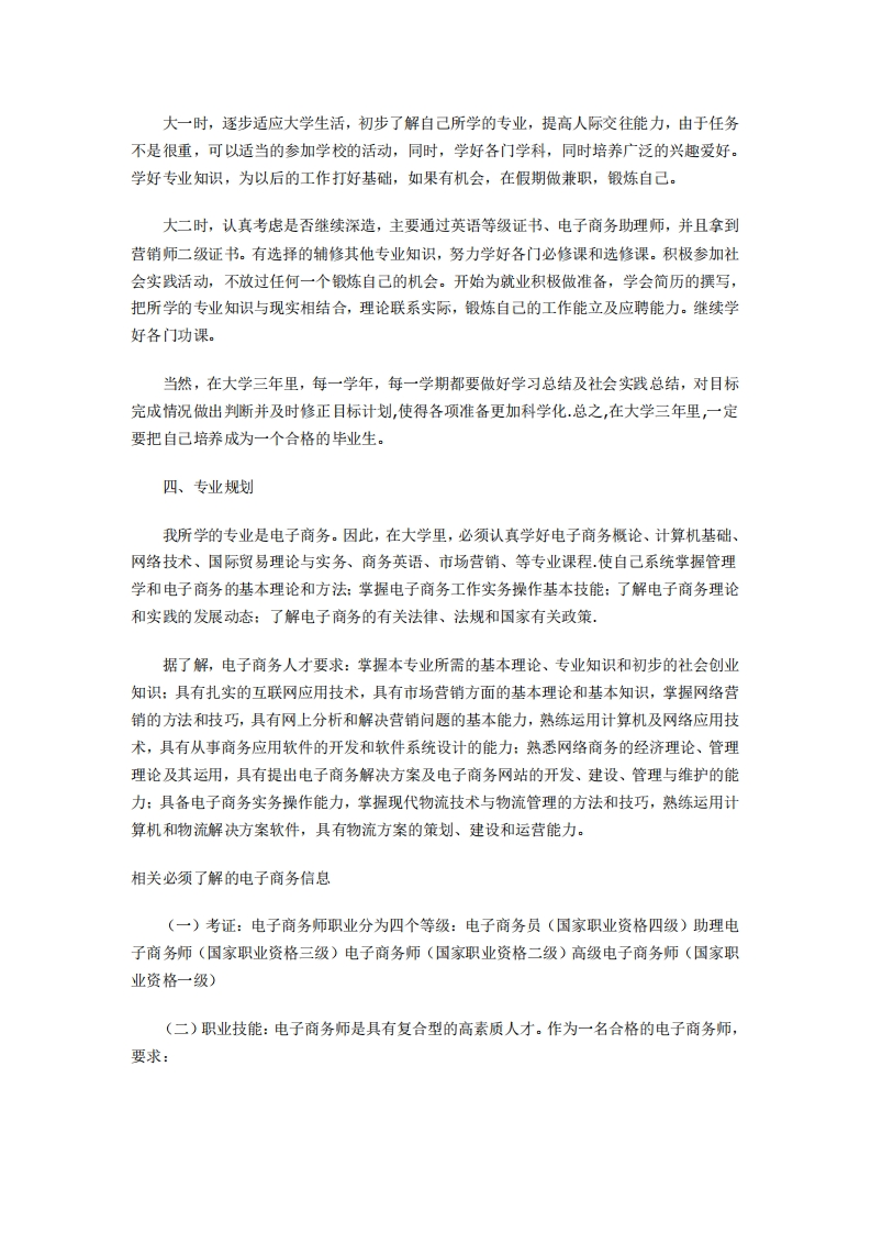 电子商务专业职业生涯规划一、前言在今天这个人才竞争的时代,职业生涯规划开始成为在人争夺战中的另一重要利器。对企业而言,如何体现公司"以人为本"的人才理念,关注员工的人才理念,关注员工的持续成长,职业生涯规划是一种有效的手段:而对每个人而言,职业生命是有限的,如果不进行有效的规划,势必会造成生命和时间的浪费。作为当代大学生,若是带着一脸茫然,踏入这个拥挤的社会怎能满足社会的需要,使自己占有一席之地?因此,我试着为自己拟定一份职业生涯规划,将自己的未来好好的设计一下。有了目标,才会有动力。一个人的大学时光一生中只有一次。与其浑浑噩噩地消磨掉四年的光阴,不如抓紧时间为自己充电,然而光有决心是远远不够的,只有有了具体的规划,才能把握好目标与方向,才能时时鞭策自己。为了更有效的完成走向社会前的学习,把握好自己的未来,我也拟订了一份自己的大学生涯规划,以时时激励自己奋发前行二、自我盘点1.基本情况所学专业:电子商务兴趣爱好:看书,上网性格特点:沉稳,偏于内向个人优点盘点:做事认真负责,一步一个脚印,自信,待人友善、宽容,人际关系良好,考虑问题比较全面,有耐心个人缺点总结:交际能力有待提高有时做事不够果断目标:在大学三年中,要扬长避短,进一步发展自己的长处与优势,积极加强与人的沟通交流,积极参加各项活动,使自己更加果断,同时努力学好各门学科专业知识。三、大学三年的规划