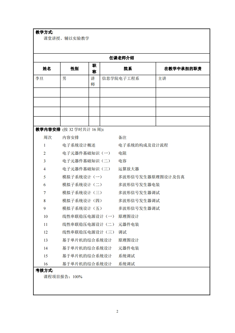 复旦大学课程教学大纲课程代码NF0130072编写时间2016年3月课程名称电子系统设计英文名称Electronic system design学分数2周学时2开课院系信息学院电子工程系任课老师李旦预修课程模拟电子技术基础、数字电子技术基础、可编程器件与硬件描述语言课程性质专业选修课通过这门课程的学习,了解并掌握电子系统的基本组成,特别是掌握模拟子系统、基于可编程器件的数字子系统和基于单片机的处理器子系统的设计方法,教学目的提高学生系统设计能力。这门课程主要讲解电子系统的构成及设计流程,介绍基本元器件(包括电阻、基本内容简电容和运算放大器)的性能指标参数,着重介绍模拟子系统、基于可编程器件的介数字子系统和基于单片机的系统设计方法。通常设置合理的实验,让学生掌握电子系统设计方法。教材和教学参考资料作者书名出版社出版日期俞承芳等电子系统设计复旦大学2004.9教材和黄勤等单片机原理应用清华大学2010.9教学参考资料基本要求:1、掌握元器件(包括电阻、电容和运放放大器)性能指标参数2、掌握模拟子系统的设计方法3、掌握数字子系统的设计方法4、掌握基于单片机的系统设计方法