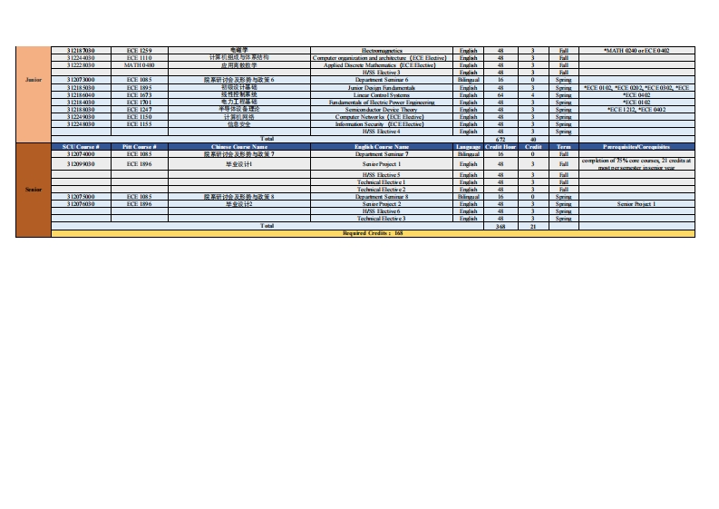 Elee trical and Com puter Enginee ring Sample Curric ulum Se hed ule Class2022SCU CaunehfCa■mgHChinse Coun NaneEaglih Cours NaneCraditTeraPrerequxiles1021030油与尚38900010体商1Pryxicd Edxation-l913003010生心理康Mertal Healh Educatione163106010ENGR 08131216030ENGCMP0152可Endsh CommpodtionEndwhFal/Spring31216010EC0140-I语口语乐加接工h16313090010ENGOMPOI5A作中Wh里Cat年utadndwh16FS里31300a0407AH0230折机F与规分山h6431109040HY3014键物理1理工Pryxiex Sor Science and Engncering IEndih644Fal/Spring31010030CHEM0060TEG71Gener Chemitry Sor Engneas Ih3312170m30ENGR 0011分好论F.lI10060030]The Oufine of Chingae Modan HtorycS里0001010能16900105120里技门Mitey Tranine1122hrrna%09010信商2Edxation-23220101中华文化(历史司文学篇学艺术篇司Chicse CuureChinese下s电9004920工化实32S里3151050父0R2断生研验聚级2Froamn seneBinal1631u+ENGR0R131216010EBC042h16S里31109040MATH0230折日与洁积分2Arly tc Gcomtry and Caleuu 2h6码4Fal/SpringAH0230313009040FHYS 0175基物理2-理工iex for Scimnce and E里2E时h6码4FS里*PHYS013131I030CHEM0920工化学2hS里5飞f00031216030ENGR 0012工程o里Computngh3S里G001Tatil953SCU CounePitt CourseCHme Caung NaneEaglik Coune NameLagaCraditrPsereq uhileCareqsiies104491303¥0l0修商-3Pryxicd Edxation-3Chincae23120000ECE 1085发册换及形期适送3Dpartnert Sanine 3Bnial0313180305P02美话写作hENGOMP 015231109040MH020程折小日当极分3Ac四ntry and C3h4Es型*MLATH023031218040E0101线性吧与】h6网4+ENGR 0012CBO:HHYS 0175312175040E01数与使实验Digti Cirutx&Sysemtlabh644组ENG 0012CEO:HHYS0175312170309E001用C++速E写题h里0l2312172030E001CE升析方流ECEAmlytial Methodkh3Fall/SpringAH2到CKEO ENGR0123名a图四10446030毛泽车思想和中围恸色杜叠主义论体系概论3spi电104H030习近平新时代中图储色社金主义思想振论Anlrtrodaction to XiJi甲nhu点on Socialam withChincae动spmi吧8a102010体商4Phroica Edxation-432S里3171000Dxpartnert Sanine 4160S型22820PHYS0219工物实2s01312172040EE0102子红Mcroclectronic Circutst Lahh6S里EE01031217040ECE 0302人处接口道幻h64S型CE0L里01312130030E0里02数提结构与进D由Stuture&NomS信里EE0301312131030B002子,系与h3S里E里040H/5S Pectiive 2Endih31层98Pitt Course0。Eariih Cauns NamkLangsage Crodit HaurCroditTeraPireq uhileCarequisies31372100ECE 108516031218030E12I2克子话计验FlectonicCrat Doim Lahh车*ECE0102,*ECE 09023213030BE1560数字信处理3