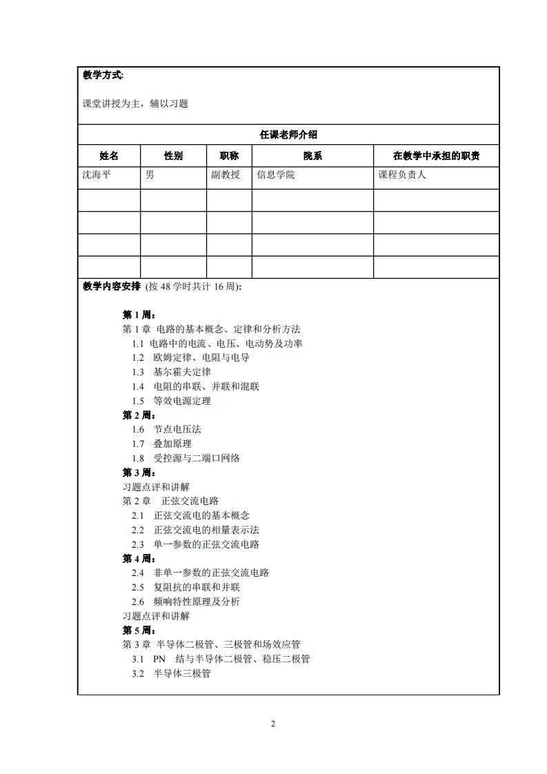 复旦大学课程教学大纲课程代码NF0130263编写时间2016.3课程名称电子学方法英文名称Electronics Methods学分数3周学时3开课院系信息科学与工程学院任课老师沈海平预修课程普通物理、高等数学课程性质专业选修课程通过本课程的学习,使学生掌握电子电路的基本理论、知识和分析方法:培养学生教学目的综合分析、解决和处理电路问题的能力:培养学生学习电路知识的兴趣和能力。该课程主要内容包括4部分:1)电路分析基础,包括电路基本概念、定律和分析方基本内容简法:2)正弦交流电路,包括基本概念和分析方法:3)模拟电子技术,包括各种器介件的结构和特性、基本放大电路分析方法和运算放大器的应用:4)数字电子技术,包括基本概念、定律、逻辑函数及门电路。教材和散学参考资料作者书名出版社出版日期李洁电子技术基础(第二版)清华大学出版社2012.5教材和陈光梦模拟电子学基础(第二版)复旦大学出版社2009.9教学参考资陈光梦数字逻辑基础(第三版)复旦大学出版社2009.12料基本要求:基本概念、定律等理论知识要做到概念清楚、原理明白,并应当对有关知识形成较长时间的记忆:而电路分析方法则要求熟练掌握并能分析和解决实际问题。
