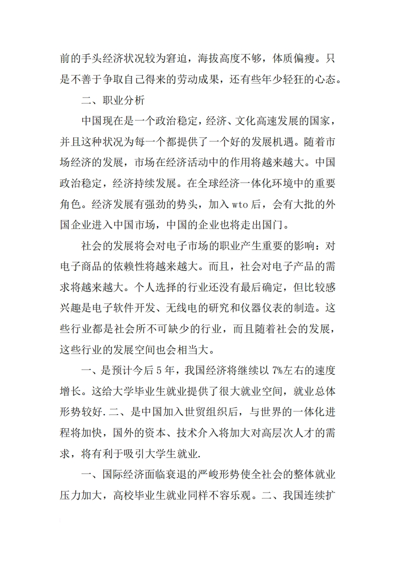 电子职业生涯规划书大学时代,是职业规划正当时。因此,我们大学生应尽早进行职业生涯规划,最好从我们步入大学校园就开始。要了解自己的长处和短处,知道自己的兴趣,制定好职业日标,规划好自己的职业生涯,在大学期间不断评估与修正,朝着自己的目标去奋斗。电子职业生涯规划书范文一、自我分析自己是属于那种很外向的人,善于沟通,曾经有过兼职推销人员的经历并取得相当不错的成绩,那时我学会了许多我不知道的东西,我知道了挣钱的辛苦,而且对商场的竞争有所了解。但是,我自己所学的专业也是应用电子专业,这个专业是我的兴趣,我想通过现阶段的了解,可以对电子市场有所认识,这正是我的兴趣所在啊。业余爱好:看书、听音乐、电子产品的改装等。爱看的文学作品:《战争与和平》、《红楼梦》等。喜欢的歌曲:《爱拼才回赢》、《难忘今宵》、《北京的那一夜》等。心中的偶像:比尔?盖茨。优:乐观积极,有上进心,有责任心;良好的沟通能力,人际关系良好,具团队精神和协作能力,有较强的创新意思,有很强的动手实践能力及自学能力。做事仔细认真、踏实,友善待人,做事锲而不舍,勤于思考,考虑问题全面。缺:目