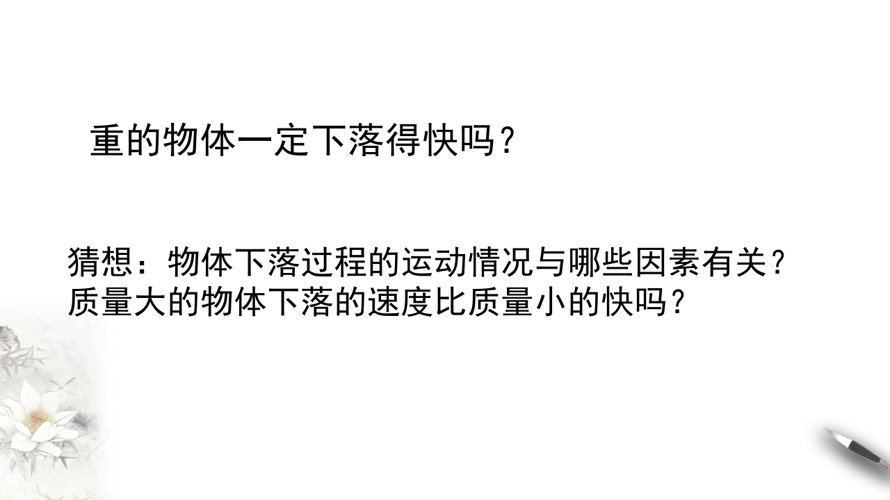 2.4自由落体运动知识讲座课件348072@abc昨天发布关注私信1.07MB34页0242.4自由落体运动知识讲座课件此内容为付费资源,请付费后查看¥9¥20黄金会员免费钻石会员免费立即购买您当前未登录!建议登陆后购买,可保存购买订单付费资源 第1页 / 共34页 第2页 / 共34页 试读已结束,还剩32页,您可下载完整版后进行离线阅读 THE END初中教育高中教育 文本预览 人教版必修第一册2.4自由落体运动 查看更多 收起部分 喜欢就支持一下吧收藏