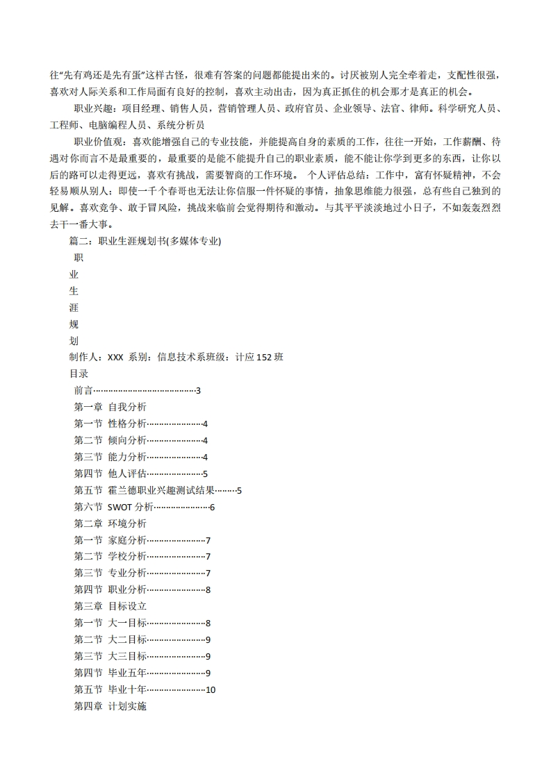 多媒体行业个人职业规划怎么写,媒体行业的职业生涯规划书篇一:多媒体专业职业生涯规划书三十四制作人:唐祥荣学号:1513770590101234系别:信息系年级:2015级班级:计应152目录前言……3第一部分自我认知…4第二部分环境分析…6第三部分SWOT分析7第四部分目标的定位与制定…8第五部分目标的实现……9第六部分反馈与修正…g结束语…I0前言在今天这个人才竞争的时代,职业生涯规划开始成为就业争夺战中的另一重要利器。对于每一个人而言,职业生命是有限的,如果不进行有效的规划,势必会造成时间和精力的浪费。作为当代的大学生,若是一脸茫然踏入这个竞争激烈的社会,怎能使自己占有一席之地?梭罗说过:“人是自己幸福的设计者”。我认为人只有有了目标,才会有动力。路是脚踏出来的,历史是人写出来的,人的每一步行动都在书写自己的历史。因此,我为自己拟定一份职业生涯规划。有目标才有动力和方向。所谓“知己知彼,百战不殆”,在认清自己的现状的基础上,认真规划一下自己的职业生涯。一个有效的职业生涯设计必须是在充分且正确认识自身条件与相关环境的基础上进行的。要审视自己、认识自己、了解自己,做好自我评估,包括自己的兴趣、特长、性格、学识、技能、智商、情商、思维方式等。即要弄清我想干什么、我能干什么、我应该干什么、在众多的职位面前我会选择什么等问题。所以要想成功就要正确评价自己。第一部分自我认知个人性格:沉着冷静,乐于助人,低调自信,善于与人交流,有幽默感兴趣爱好:打篮球,玩游戏,和朋友一起出去玩,喜欢参加户外活动,对团队类型的活动比较喜欢,喜欢听音乐自我评价:对自己总是有与别人有独到的见解,有着不错的领导能力,有着远大的抱负,在团队中能够很好的融入其中,面对事情能够沉着面对,对待小事能够注重细节用最恰当的方式去处理。父母评价:比较贪玩,善于与父母沟通,懂事听话,思想成熟。师长评价:积极的参加活动,有领导能力,能和同学之间相处融洽友人评价:是个比较热心肠的人,有点拖延症,有幽默感,在困难的时候会积极帮助同学,有爱心综合评述:能够和不同类型的人相处,努力并且乐观,积极向上,有自己独特的个性,但是做事有点拖延,做事会有点毛躁,但是还是有不错的领导能力。评测工具:霍兰德职业兴趣测验(SDS)结果:1富有怀疑精神的事业型职场性格:有个远大的目标有抱负。有很强的探索欲、求知欲,脑子如同4核的CPU不停的思考。往