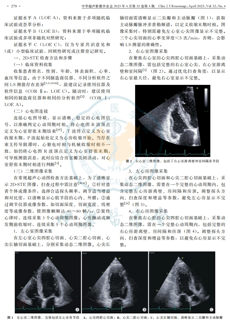 中华超声影像学杂志2023年4月第32卷第4期Chin J Ultrasonogr,April2023,Vol32,No.4·277··标准与规范·二维斑点追踪超声心动图心肌纵向应变规范化检查中国专家共识(2023版)中国医师协会超声医师分会心脏超声专业委员会通信作者:舒先红,复旦大学附属中山医院心脏超声诊断科上海市心血管病研究所上海市影像医学研究所,上海200032,Email:shu.xianhong@zs-hospital.sh.cn基金项目:国家自然科学基金项目(82071933,82202178)D0I:10.3760/cma.j.cn131148-20221027-00726Chinese expert consensus on standardized myocardial longitudinal strain imaging using two-dimensional speckle-tracking echocardiography (version 2023)Echocardiography Committee of Chinese Ultrasound Doctor AssociationCorresponding author:Shu Xianhong.Department of Echocardiography,Zhongshan Hospital,FudanUniversity,Shanghai Institute of Cardiovascular Diseases,Shanghai Institute of Medical Imaging.Shanghai 200032,China,Email:shu.xianhong@zshospital.sh.cnFund program:National Natural Science Foundation of China (82071933,82202178)D0I:10.3760/cma.j.cn131148-20221027-00726超声心动图是诊断心血管疾病的首选影像学技动与拓展了LS的临床应用。术。超声测定射血分数(ejection fraction,EF)是我国许多学者已开展了LS的基础和临床应用研评价心脏收缩功能的常用方法与参数。随着超声心动。1究2J,但目前缺乏统一的基于2DSTE的LS标准图技术不断发展,新的超声成像方法与参数被应用于化检查和测量方法及其正常参考值。中国医师协会超心功能评价。心肌纵向应变(longitudinal strain,A声医师分会心脏超声专业委员会组织专家,结合国内LS)是继EF后最具临床应用前景的心功能评价指标外相关文献和指南,根据我国国情和临床应用现状,之一山。LS是指心肌收缩与舒张活动在长轴方向上撰写了本共识。本共识针对LS应用的图像采集方的形变大小,即拉格朗日(Lagrangian)应变(e),法、步骤、正常参考值、主要临床应用等方面,给出e=△L/L。=(L-L。)/Lo,△L为心肌长度改变量,了具体建议,旨在进一步推进LS的规范化临床应L。为心肌初始长度值,L为改变后的心肌长度值,号用。C心肌缩短时应变为负值,心肌延长时应变为正值,单本共识对检查方法推荐类别(class of位为%。整体纵向应变(global longitudinal strain,recommendation,COR)的表述沿用国际通用的方GLS)指整体心肌纵向应变大小,是所有心肌节段纵式:向峰值应变的平均值)。最初,组织多普勒技术评价I类指征(CORI):指已证实和(或)一致公心肌应变时,对声束方向与心肌运动方向,应变参数认有益、有用和有效的操作或治疗;值具有角度依赖性,其临床应用受到一定限制)。二Ⅱ类指征(CORⅡ):指有用和(或)有效的证维斑点追踪超声心动图(two-dimensional speckle据尚有矛盾或存在不同观点的操作或治疗:tracking echocardiography,2D-STE)则是通过追踪Ⅱa类指征(CORⅡa):有关证据/观点倾向于心肌内回声斑点的空间运动,以反映心肌组织的实时有用和(或)有效,应用这些操作或治疗是合理的:运动和形变。2DSTE应变参数获取更为简便,在诸Ⅱb类指征(CORⅡb):有关证据/观点尚不能多心血管疾病的诊断、危险分层以及预后判断等临床被充分证明有用和(或)有效,可考虑应用:应用中敏感性高、重复性好,且具有独立于E℉的增Ⅲ类指征(CORⅢ):指已证实和(或)一致公量价值)。近年来,欧洲心血管影像学会和美国超声认无用和(或)无效,并对一些病例可能有害的操作心动图学会在相关指南与共识中,均推荐了基于2D-或治疗,不推荐使用。STE的LS正常参考值4)。同时,多部国内外指南对证据来源水平(level of evidence,LOE)表与专家共识中也纳入了LS评估内容],极大地推达如下: