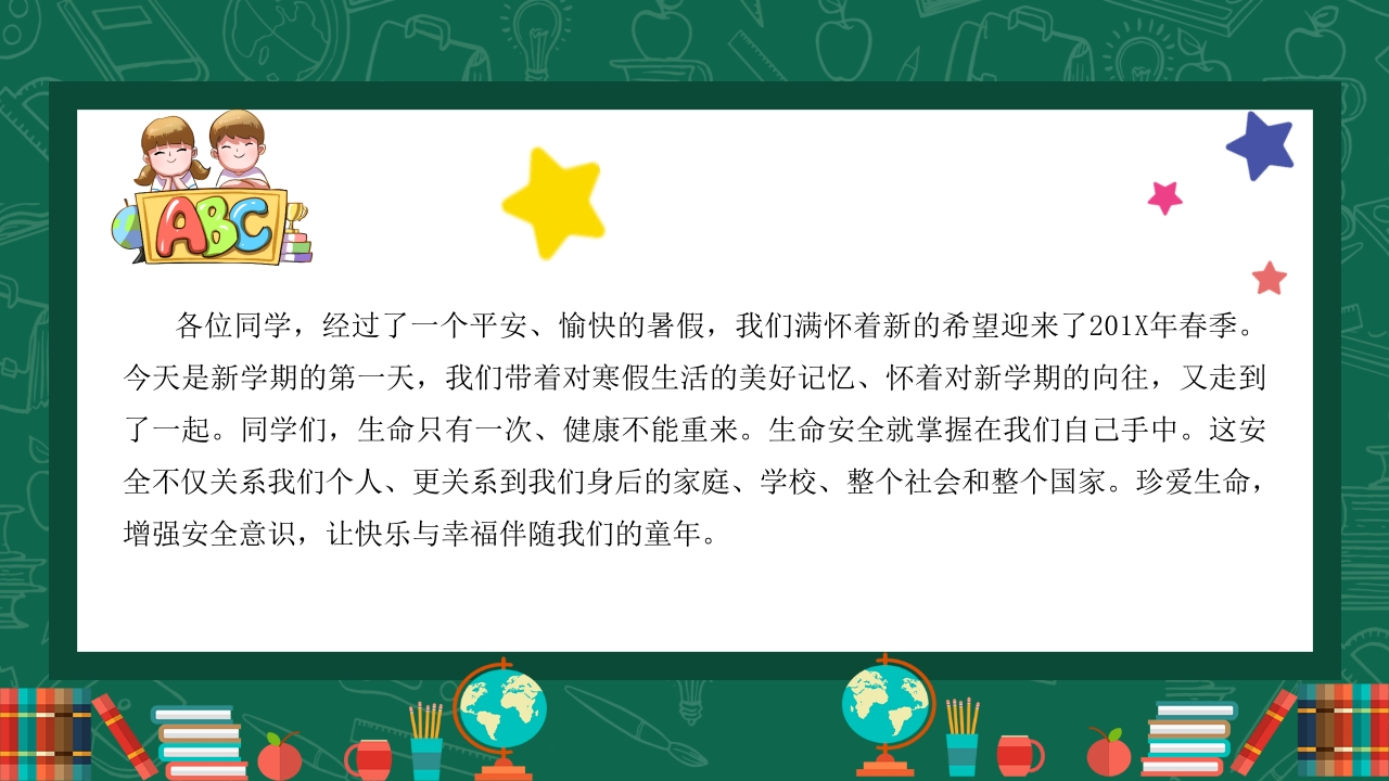 开学第一课-安全行为养成教育348072@abc8天前发布关注私信10.89MB25页040开学第一课-安全行为养成教育此内容为付费资源,请付费后查看¥9¥20黄金会员免费钻石会员免费立即购买您当前未登录!建议登陆后购买,可保存购买订单付费资源 第1页 / 共25页 第2页 / 共25页 试读已结束,还剩23页,您可下载完整版后进行离线阅读 THE END初中教育小学教育高中教育 文本预览 ABC开字第一课【安全行为习惯养成教育】■■■■■■■■■■:主题班会汇报人:汇报时间: 查看更多 收起部分 喜欢就支持一下吧收藏