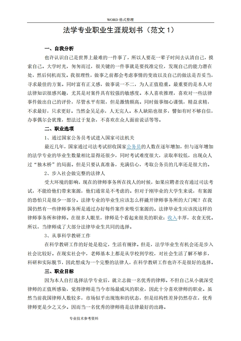 WORD格式整理法学专业职业生涯规划书(范文1)一、自我分析也许认识自己是世界上最难的一件事了,所以人要花一辈子时间去认清自己,摸索自己。大学时光,匆匆而过,很关键的一件事就是要找准定位,发现自己的能力潜在处,然后伺机而发。我很理性,做事之前都会考虑事情的变故以及自己的做法是否妥当,寻求最佳的方案。同时富有正义感,做事说一不二,为人正值稳重。最重要的是本人对法律知识很感兴趣,尤其是对案件具有较强的敏感度。本人喜欢推理,喜欢对一些法律事件做出自己的评价,尽管水平有限,但是激情颇高。同时做事细心谨慎,精益求精,不求最好,只求更好。当然金吴足赤,人无完人。本人缺陷也很多,譬如有时不够自信,办事偶尔会犹豫,想法过于复杂,不喜欢在众人面前说话等等。二、职业选项1、通过国家公务员考试进入国家司法机关最近几年,国家通过司法考试招收国家公务员的人数在逐年增加,但与逐年增加的法学专业的毕业生数量相比显得还很少,同时考试难度很大,录取率较低,出现众人过“独木桥”的局面。但是只要认真准备,充满信心,考取公务员的几率还是很大的。2、步入社会做完整的法律人受大环境的影响,现在的律师事务所在找人的时候,如果应聘者没有通过司法考试,不能给他们带来案源,他们通常是不考虑的。但对于刚毕业的大学生来说,有案源的恐怕只是很少一部分。法律专业的毕业生应该怎么样撬开律师事务所的大门呢?在我国仍然有一些律师事务所是通过办好每件案件来吸引案源的。法律毕业生应该找这样的律师事务所和律师。在很多人眼里,律师是个看起来很美的职业:收入丰厚,衣食无忧。所以,当律师成了大部分法律毕业生共同的选择。3、从事科学教研工作在科学教研工作的好处是稳定,生活有规律。但是,法学毕业生有机会还是步入社会比较好。在现实社会中,老师基本上都是从学校到学校,对社会生活了解不够多,科研和实际脱节,因此想成为一个完整的法律人,在科学教研工作也许不是很好的选择。三、职业目标因为本人自打选择法学专业后,就立志做一名优秀的律师。不但自己从小就深受律师的正值所感染,觉得律师是当今市场最威风的职业,因此十分喜欢律师的职业。虽然当前我国律师人数较多,市场似乎出现饱和的状态,但是结构性差异仍然存在,优秀律师更是少之又少。因而当一名优秀的律师将是法律最好的出路。专业技术参考资料