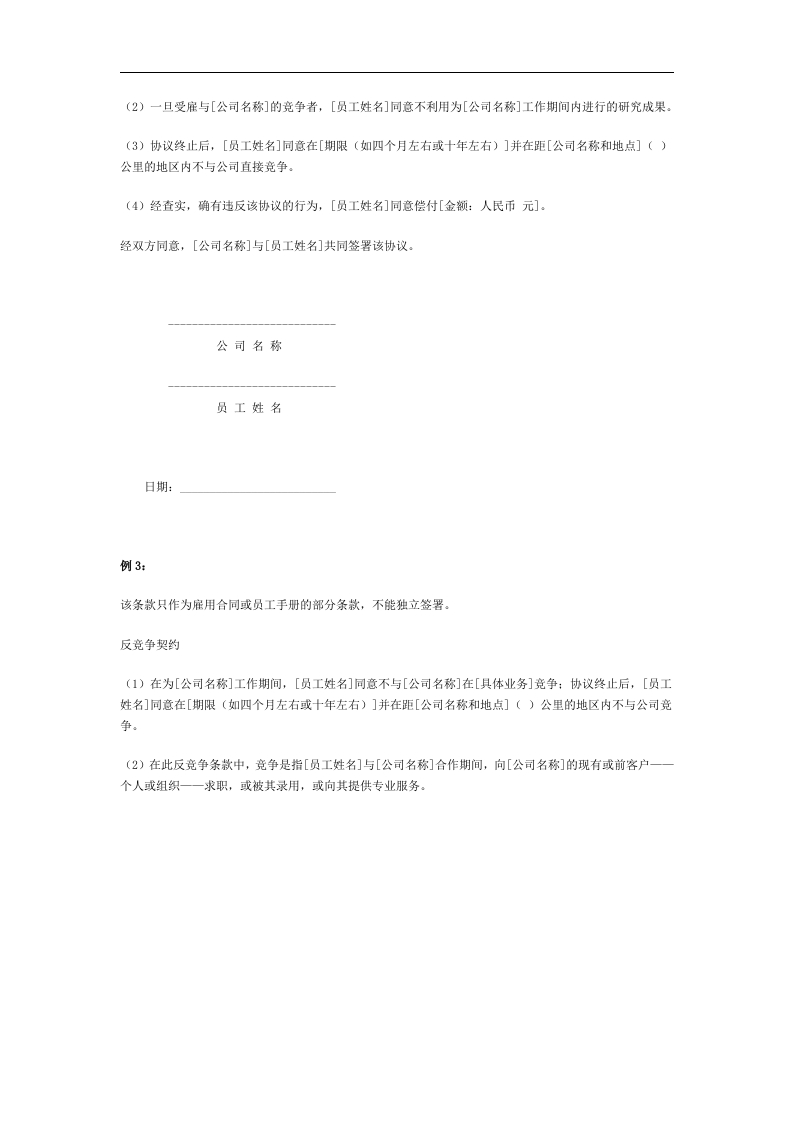 反竞争协议样本例1:该协议十分完整,适用于没有签署正式雇用合同的员工。反叛公开和反叛竞争(1)在该协议生效期间和终止后,“员工姓名”同意不公开“公司名称”的客户名单,商业机密,或其他保密资料。“员工姓名”同意采取合理的安全措施防止意外泄密和行业内部的间谍活动。(2)协议生效期间,员工同意尽其所能完成[描述工作职责],并遵守该协议中的反公开和反竞争条款:为此,公司对员工也有所补偿:[表述具体补偿方法]。协议终止后,[员工姓名]同意在()年期限内及在距[公司名称和地点]()公里的地区内不与公司竞争。若因[公司名称]违反协议而被迫终止该协议,则该项条款不再适用。竞争意味着建立涉及以下业务的公司或为涉及以下业务的公司工作:[描述员工可能从事的工作](3)若有违反该协议(2)项条款的行为,[员工姓名]同意偿付[金额:人民币元]。经双方同意,[公司名称]与[员工姓名]共同签署该协议。公司名称员工姓名日期:例2:该样本应作为雇用合同或员工手册的部分条款。该协议可独立签署,也可与其他雇用协议共同签署。反公开和反竞争(1)协议终止后,[员工姓名]同意保守[公司名称]专利、商标的秘密和商业机密,并不向他人透露有关情况。