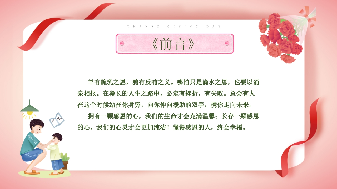 感恩节主题班会348072@abc8天前发布关注私信36.96MB23页032感恩节主题班会此内容为付费资源,请付费后查看¥9¥20黄金会员免费钻石会员免费立即购买您当前未登录!建议登陆后购买,可保存购买订单付费资源 第1页 / 共23页 第2页 / 共23页 试读已结束,还剩21页,您可下载完整版后进行离线阅读 THE END初中教育小学教育高中教育 文本预览 TH A NK SGI V I N G D A Y6月的第4分感药主题班会路/有/你UAVE YOU ALL THE WAY_Thanksgiving education theme classmeeting pptXX年XX班THANKSGIVING感/恩/有/你/一/路/陪/伴演讲人:DAY感思有你趁现在及时爱 查看更多 收起部分 喜欢就支持一下吧收藏