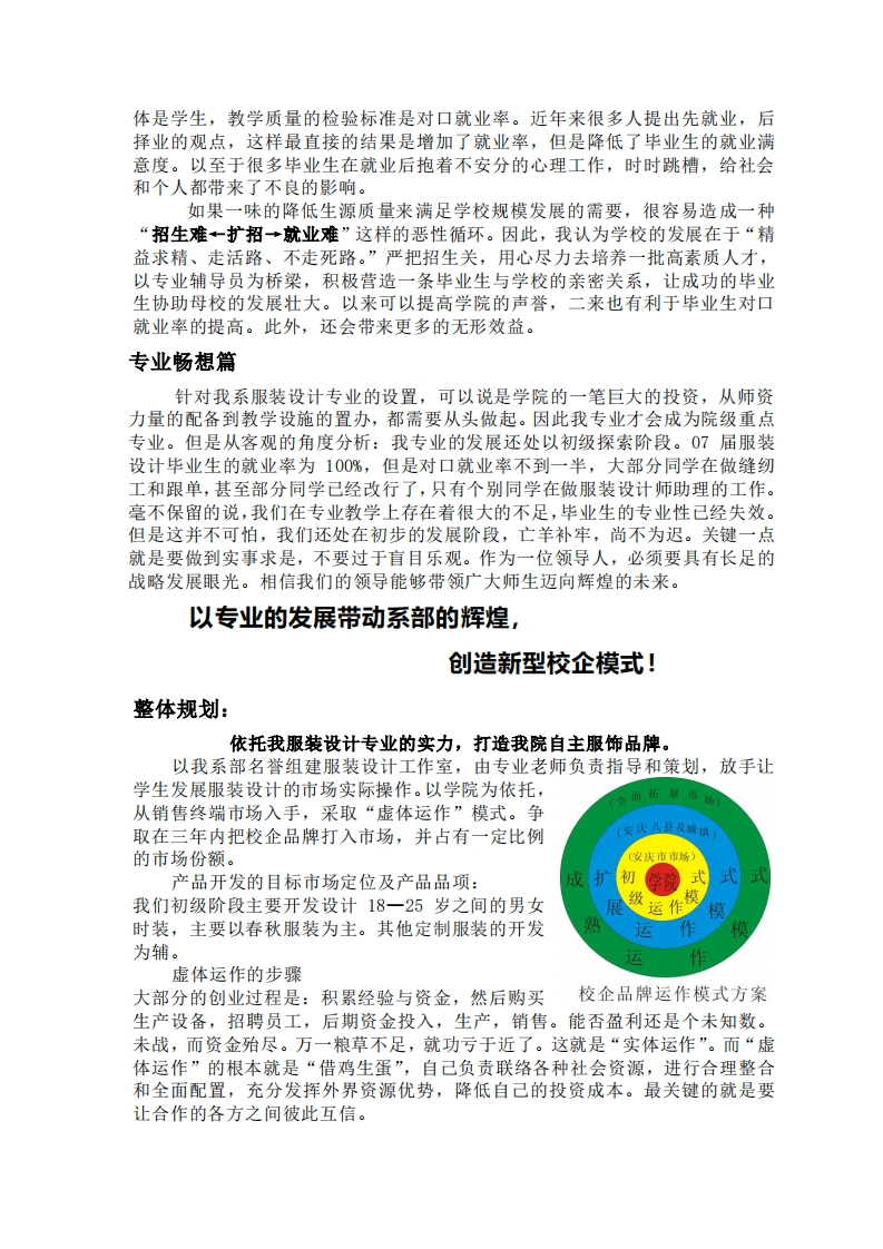 服装设计专业发展规划建议实情篇1.国内高职发展现状:自1999年开始,国家开始推行高校扩招计划。在大学生不断增长的同时,高校数量也骤然飞增。随着我国大力支持提高国民受教育文化程度的同时,国内大学生就业的问题却越显突出。我国正处于经济高速增长的发展阶段,正需要大批的高素质技术人才。但是大学生就业难问题却是年年得不到解决。据有关报到,其实企业缺的不是大学生,而是人才。有句古语说得好:“子不教,父之过。教不严,师之过。”造成大学生就业难的国家问题不仅是学生本人的原因,作为教书育人之圣殿的诸多高校也难脱干系。近年来大学生就业状况:2009年5月26日中新社北京二月二十三日电(记者闫晓虹)权威统计显示,2008年全国高校毕业生532万人,全国平均就业率为70%。2009年中国高校毕业生人数又将再创新高一一达到610万人,还有100多万历年没有就业的大学生,加之金融危机导致部分企业发展失利,求职人数的激增、经济增长的放缓,使得今年中国应届毕业生在就业问题上面临着不同以往的难题。中国社会调查所最近在上海、北京、深圳、石家庄、郑州、成都、沈阳、武汉、厦门、哈尔滨、西安等地抽取一千位应届大学生进行调查显示,到目前5月份为止09年大学生就业率整体为35.6%,之前社会保障部发布消息力争09年大学生就业率达到七成,但是距离目标完成尚有一段距离。调查样本显示,已就业者总体满意度为近三成八,有三成五的人认为工作一般,仅有约二成七的人表示对工作满意。对现有工作不满意的原因主要集中在工作性质及内容、薪金待遇、人际关系三方面。反映出所学与所用之间,学校专业设置与社会需求之间的矛盾,对人际关系的不满意反映学生初入职场时对社会的不适应,人际交往能力欠缺。此外,约七成一受访者认为当前就业形势严峻不好找工作。对于“对未来的就业前景是否存在焦虑情绪“的提问,有五成六的受访者表示非常焦虑。样本显示,最理想职业中,二成八的大学生选择国家机关,之后是国有企业、科研单位、学校这些较稳定的企事业单位:还有为数不少的大学生放弃继续求职碰壁,选择职业技能再培训。选择民营私企、自主创业的学生最少。经过三年大学准备,到了求职的大四了。根据麦可思调查,现在毕业时的大学生就业率只有55.8%,而毕业半年后的就业率达到了87.5%。有这么大的就业率差距,就说明大学毕业生缺乏对就业市场的认识,所以在求职中不断地碰钉子,才逐渐了解到大学生就业市场的真实信息,认识提高得快的同学就实现了毕业即就业,认识得慢的同学在毕业后才逐渐实现了就业或无法就业。没有信息就仿佛没头的苍蝇,在求职中的成功率低,要么找不到工作,要么找不到好工作把自己贱卖了。2.我院建校历史较短,2007年才整合为一个统一的校区。至今为止,学院的规模仍然在继续扩大。但是从生源质量这一角度来看,新校区第一届学生的入校分数文科最低在408分左右,08届文科最低分数也在410分。但是09届的最低分数竞将至300多分,今年10届的入学分数甚至降到了260多分。我院的学生人数是增长了,但是在教学管理方面是否及时跟进了呢?一味的追求量的积累是否真的会促成质的飞跃?我想未必吧!学校的根本在于教学质量,其载