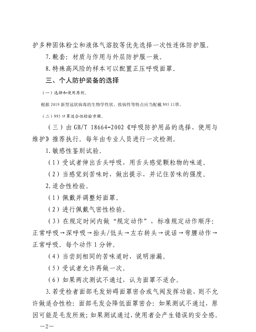 新型冠状病毒实验室检测的个人生物安全三级防护指引(第一版)为指导深圳市各级疾控部门和高水平医院在生物安全二级实验室开展新型冠状病毒的检测工作时做好个人防护,防止生物安全事故发生,特制定本技术指南。一、新型冠状病毒实验室检测的个人防护原则未经培养的感染性材料在采用可靠的方法灭活前进行的病毒抗原检测、血清学检测、核酸检测、生化分析等操作,应在生物安全二级或二级以上实验室操作,如在二级操作,个人防护装备参照生物安全三级实验室的防护要求。二、个人防护装备和作用1.医用帽子:无纺布,用于卫生清洁和头发整理。2.眼罩:有防雾和防冲击效果,可有效保护眼部安全。3.面屏:根据实际实验活动需要使用,主要用于防喷溅操作。4.N95口罩:可降低对某些粒径在0.1μm>10.0um的空气悬浮颗粒物的暴露水平。做口罩气密性测定,选择合适型号,并保证防护效果。5.内层/外层橡胶手套:保护实验操作人员,防止暴露。6.医用一次性防护服:100%的高密度聚乙烯制成柔软、质轻(克重:41克/米2)透气防水、防静电、低脱屑、耐用。可防-1