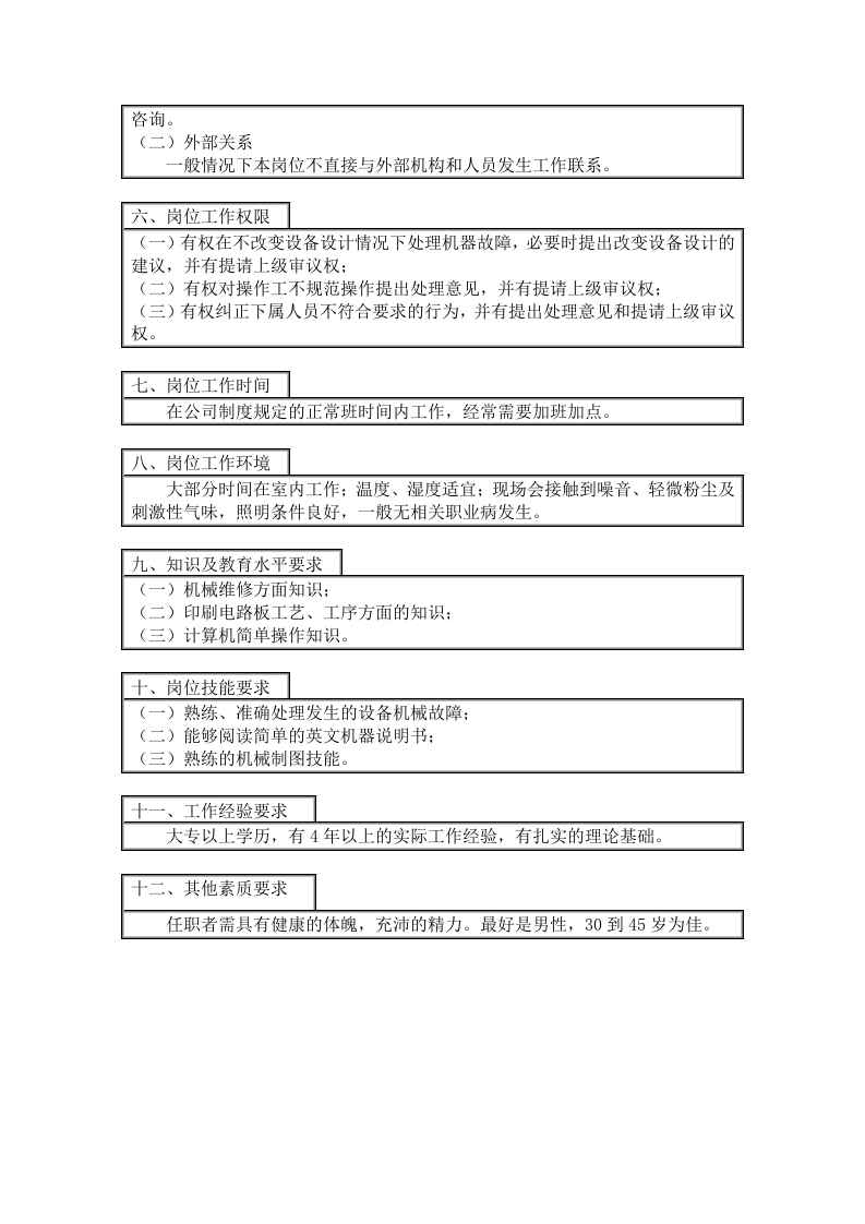 岗位工作说明书、岗位标识信息岗位名称:机械维修专管隶属部门:制造部岗位编码:直接上级:设备主管工资等级:直接下级:维修全员可轮换岗位:行政维修分析日期:二、岗位工作概述全部设备维护工作的安排和实施及机械技术指导、设备机械维修工作,确保部门业务计划的完成。三、工作职责与任务(一)负责公司内设备日常故障维护工作安排、人员调动:(二)负责公司设备的机械维修工作及机械技术指导:(三)按设备保养手册和设备说明书制订保养计划建议,并按计划安排、实施保养工作,确保保养实现率及保养效果达标:(四)根据库存情况提交备件采购申购表,负责备件的验收与急购备件的提交,审核机械备件采购单的必要性、合理性:(五)指导操作工完成设备使用及简单保养工作:(六)做好日常设备的巡视检查工作,及时发现问题,处理隐患:(七)负责根据备件消耗情况提交降耗及国产化建议,并逐步降低设备维修备件消耗:(八)做好预防性保养、维护工作,解决疑难故障,降低公司总停机工时及设备原因造成的总报废量:(九)完成上级委派的其他任务。四、工作绩效标准(一)设备维修要及时快速,减少总停机工时,达到公司指标要求:(二)维护备件消耗费用不能超过公司下达的部门定额指标:(三)尽量减少因设备原因造成的报废,完成公司下达的部门定额指标:(四)科学安排实施保养计划,确保保养实现率低于公司要求指标。五、岗位工作关系(一)内部关系1.所受监督:接受设备维修主管的指示和监督,公司相应职能人员监督检查:2.所施监督:对操作工不规范操作、日点检设备维护监督检查,对直接下属工作完成情况、工作状态监督检查:3.合作关系:与工艺工程师协商探讨解决影响产品质量的因素:与计划员协调设备预防性维护、保养的实施时间安排:当设备发生疑难故障时,向供应商