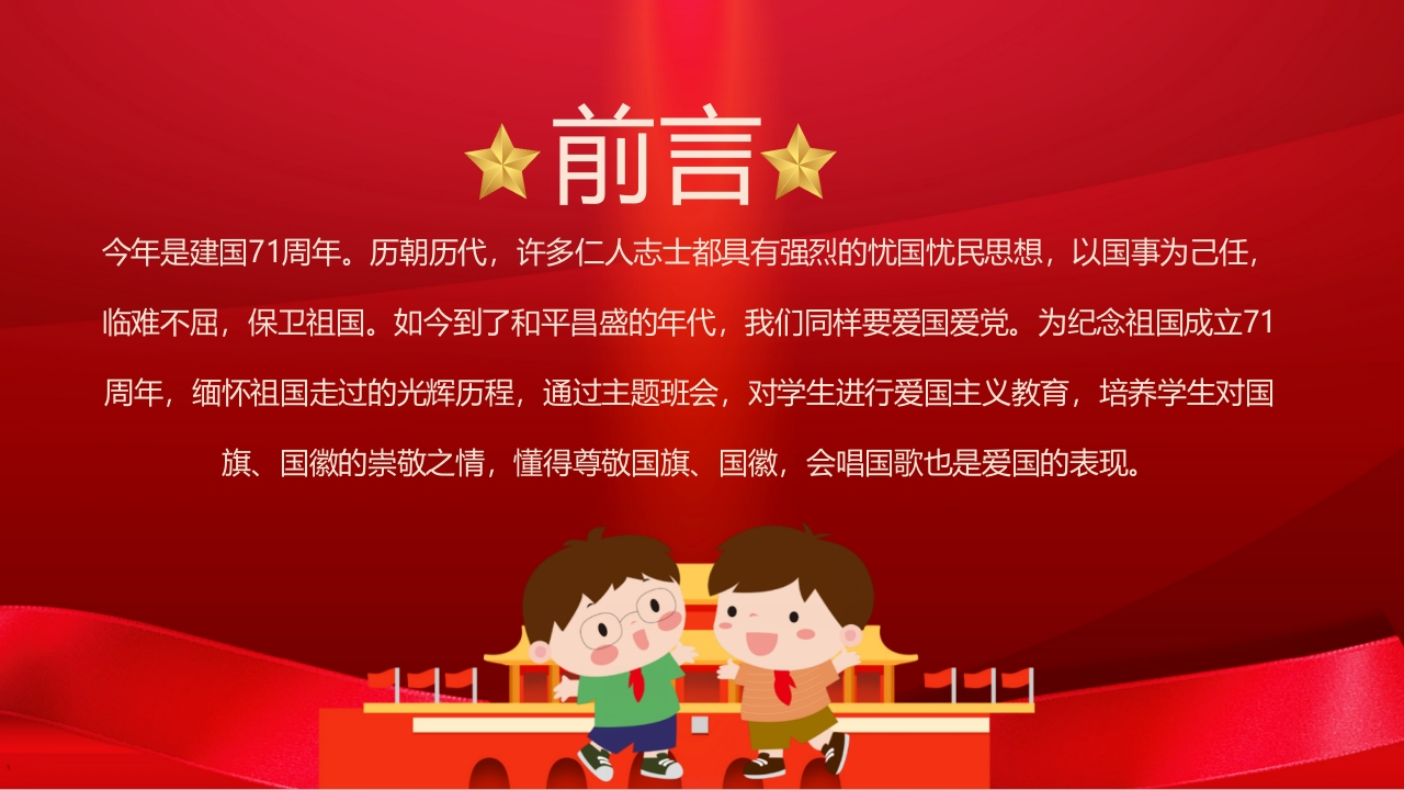 传承红色基因向国旗敬礼-02348072@abc17小时前发布关注私信7.89MB21页024传承红色基因向国旗敬礼-02此内容为付费资源,请付费后查看¥9¥20黄金会员免费钻石会员免费立即购买您当前未登录!建议登陆后购买,可保存购买订单付费资源 第1页 / 共21页 第2页 / 共21页 试读已结束,还剩19页,您可下载完整版后进行离线阅读 THE END初中教育高中教育 文本预览 传红色基因时国敬培养学生对国旗国徽的崇敬之情懂得尊敬国旗国徽宣讲人:时间: 查看更多 收起部分 喜欢就支持一下吧收藏