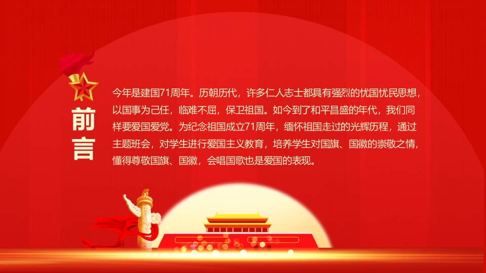 传承红色基因向国旗敬礼-03348072@abc16小时前发布关注私信8.71MB21页048传承红色基因向国旗敬礼-03此内容为付费资源,请付费后查看¥9¥20黄金会员免费钻石会员免费立即购买您当前未登录!建议登陆后购买,可保存购买订单付费资源 第1页 / 共21页 第2页 / 共21页 试读已结束,还剩19页,您可下载完整版后进行离线阅读 THE END初中教育高中教育 文本预览 ★★传承红色基因向国旗敬礼培养学生对国旗国徽的崇敬之情懂得尊敬国旗国徽study and implement the spirit of the fifth plenary session of the 19th cpc centralstudy and implement the spirit宣讲人:某某某时间:20XX.X 查看更多 收起部分 喜欢就支持一下吧收藏