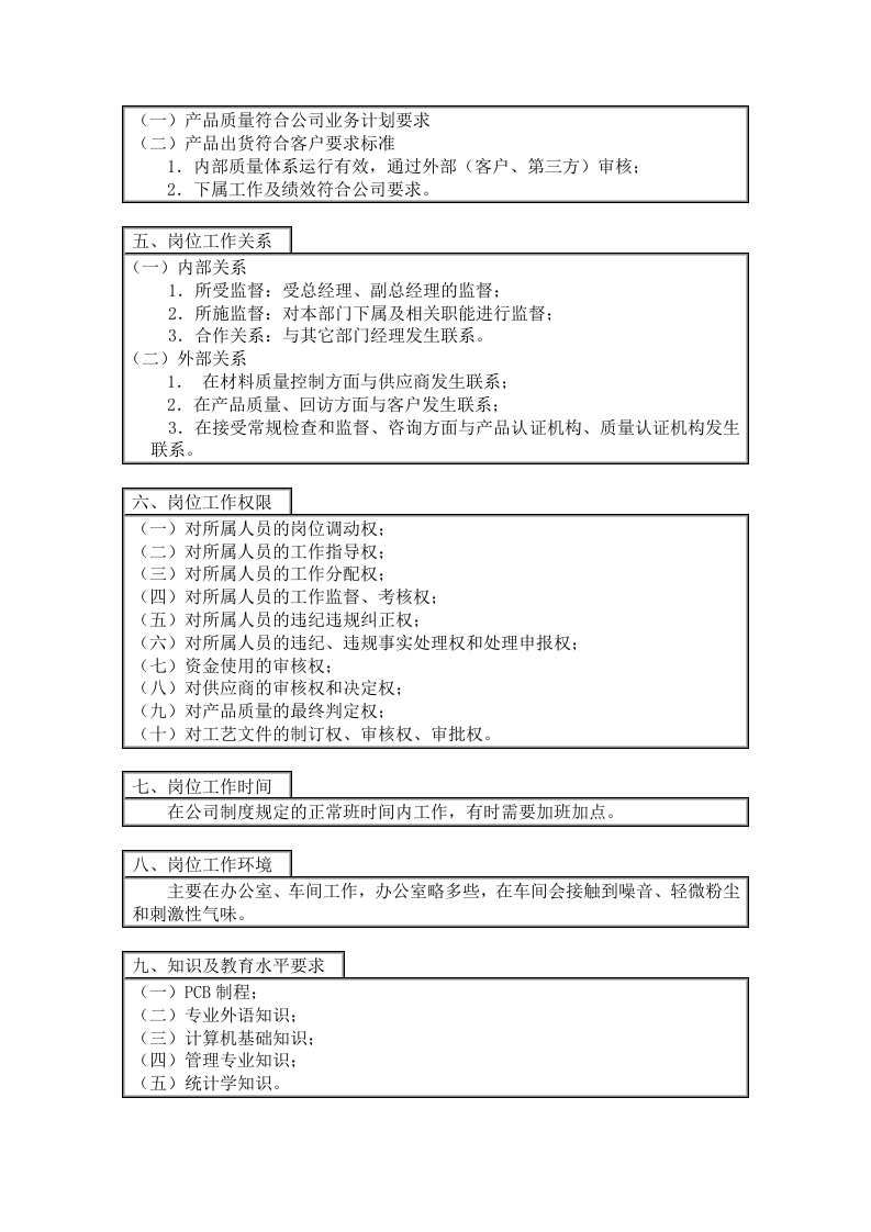 岗位工作说明书岗位标识信息岗位名称:品质保证部经理隶属部门:品质保证部岗位编码:直接上级:生产副总经理工资等级:直接下级:QC、QA、QM主管,质量监督可轮换岗位:无分析日期:二、岗位工作概述负责公司内所有与品质相关的工作,不断降低质量成本,实现公司指标。三、工作职责与任务(一)负责公司产品品质保证1.负责分供方材料进料质量保证(1)负责分供方资格的认可:(2)负责分供方的监控、优化、提升:(3)对于提交的有关原材料问题予以解决。2.负责过程质量控制(1)设定公司整体质量控制方案、分解任务:(2)监控控制方案的实施情况及合格率变化,针对客观实际进行修正。3.负责最终质量控制(1)保证出货符合客户质量要求:(2)清楚地了解客户、行业标准,提升产品质量:(3)针对客户反馈信息,修正控制方案,杜绝重复问题发生。(二)负责质量体系运行控制1.保证公司各项工作严格按照程序文件执行:2.制订内审计划,监控内审工作,提交管理评审。(三)培训/指导/评估下属及相关职能1.培训、指导(1)培训、指导产品标准和客户需求:(2)分配工作,根据具体结果指导相应工作。2.评估(1)评估下属工作效果:(2)评估相关工作职能工作效果。(四)审核审批与体系有关的各类文件1.维护现有文件有效性:2.发生变更时,对已更新的文件的有效性进行评估,予以审批:3.引入外来文件时,确认外来文件的有效性、适应性。(五)执行公司5$规范(六)完成上级委派的其他任务四、工作绩效标准