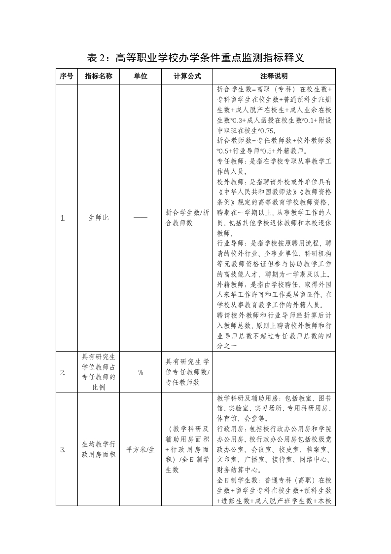 高等职业学校办学条件重点监测指标达标学校范围包括教育部门审批并备案的高职(专科)学校,不包括职业本科学校和2022年(含)以后新设的高职(专科)学校。参照《教育部关于印发〈普通高等学校基本办学条件指标(试行)〉的通知》(教发[2004]2号)规定中的学校分类和合格标准,并根据教育事业发展优化部分指标释义。表1:高等职业学校办学条件重点监测指标具有研究生生均教学科学校类别学位教师占生均教学行政用生师比专任教师的研仪器设备生均图书房(平方米/生)(册/生)比例(%)值(元/生)综合、师范、民族4000院校18151480工科、农、林院校181516400060医学院校161516400060语文、财经、政法院校18159300080体育院校131522300050艺术院校131518300060
