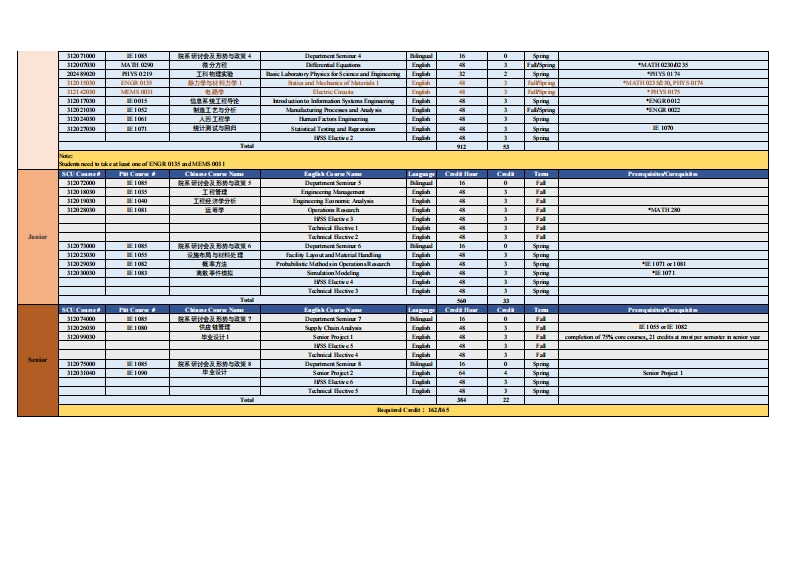 Industrial Engineering Sample Curriculum Schedule-Class 20211003面思地滋地修养与法律萃健d如ogral and Moral Cutv tionand1wBChigw3da00010体-1Irysicl Educaton-IChnge拉1山31边6010G载1新生班林会及聚烧遥1Frerren Semirur IBinanl16Fals1300信100Ce015垃高依爽文写作研习EndahCompostinEndih83Fal/gring310300LING 0007 ENOCMP美话中极写作Fd010Endlih We ting ktemlateEngih31边0010ENGCMP0152A写作中心导4a4Writng Certer Btorialfn时hwFal100004H动解几柯与种识分1Amalytic (oometry and Caleulus IEndih6研4313090AH025解斯几柯与微风分】Anaytic (comctry and Callulu】Engih28Fal/Spring3131000CHEM 0%0工化学1Gacral Chemitry Sr Engincos IEndih83NG家1工程分析ltrodxtionto Engnccring AndyssEndih831000边中近代史解要幻The (tlinc of Chinae ModemHatoryChng缩301D01010军率娃能Mltary TheoryChiese16如里00000军事技鞭Mltary TrainngChnge1122p限Fhmass00010体2Mrysicl Eduation-2Chnge数1SprngPA0009W0SW中华文花5军布军901/如B0重忧☐Chng CuureChne43Fall/pring0@2工构化学实治】Chemicl ExpaircrtChngse拉g里10010长生格价及聚石道之Frerren Scmirur 2Blinanl161s12111010ENGCMP0140类所力与口话训然Speking and LitoingEngih16p取51D00ENGCV020专业类估写作Scminr inCompostinEngihg4/en限GCe01s过考130000MAT 09解几树与神积分2Anlytic (comctry and Calculu 2Endih644SoringAH0边0107040MA BH (20解析儿柯与神分多Arlytic (corrctry and Calculu多Engish6d跟人H位0位站310090面s0174蒂地物理1-建工Mryuies Se Scimno and Enginaring IEndih64d/m限31边110边CHEM ONT化全2Gacral Chemitry SrEnginga2Endih移g型eM0220311如0N家m12计算机工程学Engincerng Corrpting3NG家0011Total557MAH2+2=4H2线ud atx cther talke bo h2nd2 l or jt take one2线om studer will be plaod n anexra00N性C01维Cmdt Hour100210马克思主义恭本原娃做能a00010体3Mrysicl Edxation-s较1d1边00E105院系研会及飞势与缓3Depurticrt&mu多Binanl160Fal31000IE尊与线性代戴导论Mtrios and Linear NlgcbraEngiih83l/n限MAH位知位刻3130000180175蒂地物理2建工Mryuis Se Scimna and Enginaring 264l/n限1W30141边100NG家02材长地构与性兼483f/n限W22s0174CM0603102300E10纠生产力分析略s1214100E100和率,随机安量与分布Pob hility,Kandomn Variabo,and DhutrhutiornEngih8dMAH位0025路1 atvelEngh考4107440边毛泽东思想和中楼色杜叠主义论体能3a国Socidim wih Chinee ChractaiticSprng10745700习近平谢代中转色牡会主义oduction n Xilnping's Tho onSocila思想和论withChnese Charatariatcs Sr aNew EraSprng0010体门Edxation-4