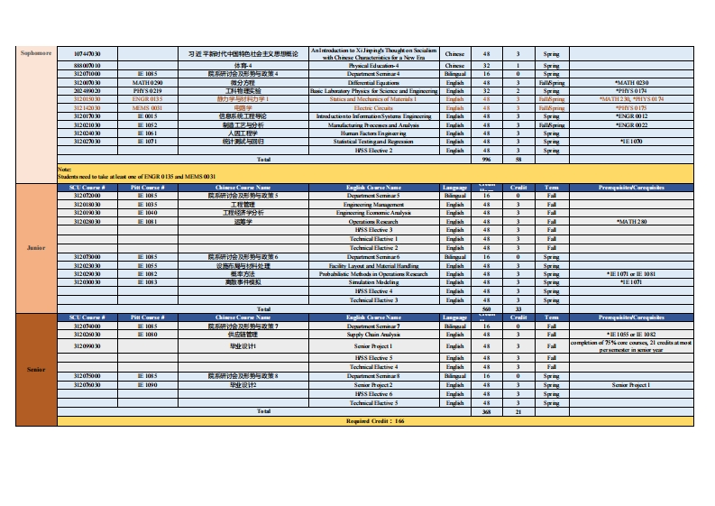 Industrial Engineering Sample Curriculum Schedule--Class 2023SCU Couns#Pitt CourseChinexe Cauns NameEaglic Caurse NameLatgearCraditTemaPrereqailes与■ACaregxiirs107210到想着德与去治ldeolbgial and Moralty and the ndc oflarwChicae483Fal8800010体容1Fyxical Educaton IChncae329120010生心T康Mertal Helth FdacationChicae16F9180100幽室环被与护理论和实线Theory and Pacticc oflabor alury xcty andcmirormnertal protectonChigae322Fal31206010ENGR 081新生研讨会及无均与欧策1Frexhnen Scmine IBingal16Fal31216310BGC量0140-I英海口海与所力塔1Endsh Speakng ad listang-lEndih16Fal31200400MATH0230解析几何与积分1Anlyte Gicomctry and Calcdu IEndih6445型3120000PHYS014基进物理1理工Hryics fr Scince and Engingering IEndih645w眼31201000CHEM0960工化学IGieneral Chemitry Sr Engincers I联h483Fall3引21000ENGR O011工程分析得论t山dm如Fngincerin电ayaEndih483Fal1070000中还代宽妻!The Outline af Chincae Madem Hatory483S眼0000010军事玉论ryh田yChicae161s座igfrth▣a0000020军皮能Mtary TrainngChicae125座跟8005010体膏2Hycal Education-2Chneae32SpigThe HitoryofChinge Commnat PartylSaninrx on10410/104120W中供党史/仕绘主义发展史/革开做史/斋中把史the Hatory of Socilit Deve由mert/The Hatory国102300M0520(匹冠一Chir's Refrn and Opening甲6由yaw322Sw吧90809020科化实整Chemial ExperimantChnee322Sw吧3120010ENGR 0082新生研时经无与策2Feahnen Semite 2Bingal16SprigG家08321603到ENGCMP 0152文与研习Engih Camrpn ionEndsh48Sr电31200010ENGCMP0152A写作中心其博Wrtng Certer TuurilEndih16Sw里3216010BC0140-2英击口齿与所力挥2Endih Spealkng ad liatenng-2Endih16S度g3120000MATH0230斯几何与积分2Arlyte Gcumnctry and Calcun2EB时h64f5里*MLATH 02203120000s0175挺碰物进2理工rpics fr Scince ad Enineering 2Endih64FllSprings01431201100CHEM0900工化学2General Chemitry红icn2Endsh48CHEV 00603121800ENGR 0012工程计慎h中中Ca里4835座里+ENGR 0011Tatal%5SCU CaunePitt CourseChinse Caun Nameaglid Ca mrse Na■eLatgwaseCraditTemPrenquiitesCareq uisies10744030马克哪王义本理he Baic Principlesof Marcimn483800010体存3Hycal Education-3Chicae32Fal90030a3刀000a0中峰文化(历史物文猫/艺术喜西学Chinee CubreChigae362FllBpring3200000E105院研胺无明与策3d160Fal3120900ENGCMP 0300业英与作Sanine in CorpoxtonEndih483Fal*ENGCMP015231200a00MATH0290电库与写视性数导论】andA中ah48FllSpingAH230312000MATH0240轮斯机5分3Anlyte (icamnctry and Calcuu 3h64f5型*MLATH 02303120100ENGR 0022材相的与世麓时h483FllSpinAH2到.Y3014CM06032023劲E1054生产力分析483Fal3214100里100率.随机变量与分布483FalAH230B形sh483Fal107400毛东想和中特色杜绘主义出论格标颗论483Sr电