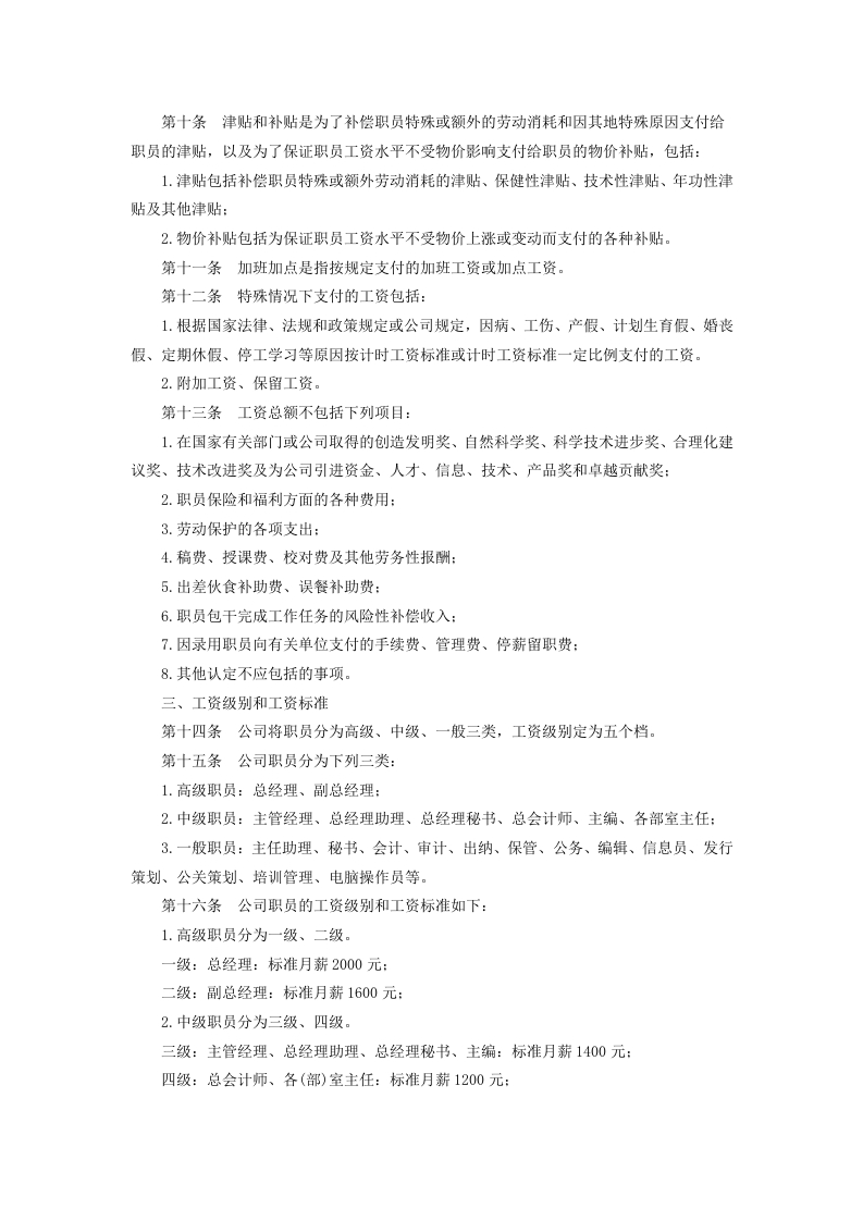 工资标准及发放办法一、总则第一条为了调动职员的工作积极性,创造最佳的社会效益和经济效益,特制定本办法。第二条公司实行效益工资制。公司职员根据全方位规范管理目标的实现情况限额递增或递减标准效益工资。第三条公司职员工资随着公司发展和经济效益的提高逐步增加第四条公司正式录用专职职员、兼职职员、特邀职员和顾问在应聘期间工资发放适用本办法。二、工资总额构成第五条工资总额是指公司在一定时期内直接支付给职员的劳动报酬总额。工资总额的计算应以直接支付给职员的全部劳动报酬为依据。第六条工资总额由下列六个部分组成:1.计时工资:2.计件工资:3.奖金:4.津贴和补贴:5.加班加点工资:6.特殊情况下支付的工资。第七条计时工资是指按计时工资标准和工作时间支付给职员的劳动报酬,包括:1.对己做工作按计时工资标准支付的工资:2.效益工资制情况下支付给职员的基础效益工资和岗位工资:3.新聘职员试用期间的见习工资。第八条计件工资是指对己做工作按计件单价支付的劳动报酬,包括:1.按超额累进计件、直接无限计件、限额计件、超定额计件单价支付给职员的工资:2.按工作任务包干方法支付给职员的工资:3.按营业额提成或利润提成办法支付给职员的工资。第九条奖金是指支付给职员完成任务或超额完成任务或创收节支的劳动报酬,包括:1.任务(定额)奖:2.超额奖:3.节约奖:4.创收奖:5.管理奖:6.劳动竞赛奖:7.其他奖金。