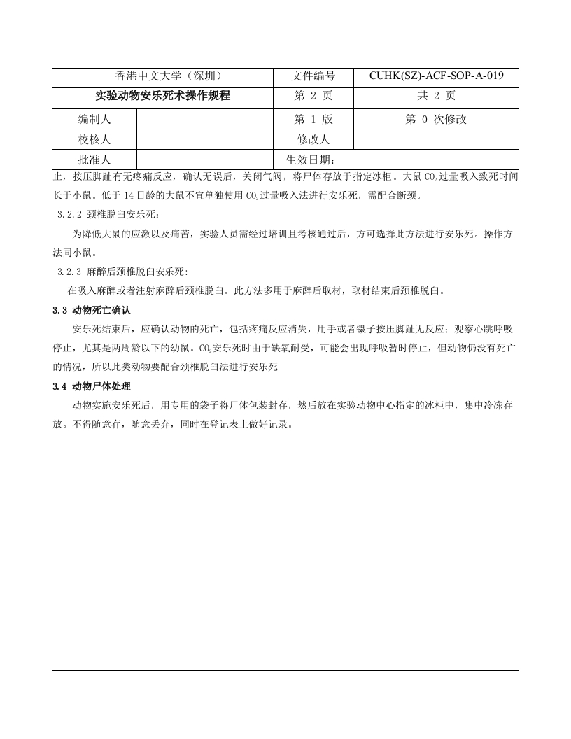 香港中文大学(深圳)文件编号CUHK(SZ)-ACF-SOP-A-019实验动物安乐死术操作规程第1页共2页编制人第1版第0次修改校核人修改人批准人生效日期:1、前言规范屏障环境中实验动物安乐死操作,保障动物福利,制定本操作规程。2、适用范围适用于屏障设施内所有实验人员。3、主体内容实验动物安乐死应考虑动物伦理福利,实验人员的安全,实验动物组织采样需求等。实验中无论采取何种安乐死方法需要香港中文大学(深圳)IACC委员会批准,如有变更及时向委员会提出申请。安乐死方法的选择本着尽量降低动物的恐惧,焦虑及疼痛的原则,禁止采用违背动物伦理福利的安乐死方法。3.1小鼠安乐死操作规程3.1.100过量吸入安乐死小鼠放在IVC笼盒中,动物密度不宜过大。放入动物前,不可先灌注C0到安乐死箱内:放入动物后扣好笼盖,在放置水瓶的入口处接入C0,气管,打开气瓶阀门,以每分钟替换安乐死箱容积的10%30%的速度灌注C0,于箱内,让C0,充满笼盒。待小鼠晕倒失去运动能力后,可加大气体流量,最大流量不能超过0.5KP,确定小鼠不动、不呼吸、瞳孔放大后关闭C0,后再观察两分钟确定小鼠死亡。小鼠安乐死后,关闭气阀,取出尸体存放于指定冰柜。低于14日龄的小鼠不宜单独使用C0过量吸入法进行安乐死,需配合断颈处死。3.1.2颈椎脱白安乐死为降低小鼠的应激以及痛苦,实验人员需经过培训且考核通过后,方可选择此方法进行安乐死。操作时将老鼠放在铁丝网上,实验人员一只手用力拉住小鼠尾部,另一只手的拇指和食指迅速用力按压小鼠头部也可以使用镊子按住小鼠的颈部,手用力拉,使之颈椎脱白,精髓与脑髓断离。此方法可使小鼠快速死亡失去意识3.1.3断颈法安乐死适用于14日龄以下的小鼠,操作时使用锋利的剪刀将头部和颈椎分离。3.2大鼠安乐死操作规程3.2.100过量吸入安乐死:大鼠放在IVC笼盒中,动物密度不宜过大。放入动物前,不可先灌注C0到安乐死箱内:放入动物后扣好笼盖,在放置水瓶的入口处接入C0,气管,打开气瓶阀门,以每分钟替换安乐死箱容积的10%30%的速度灌注C0,于箱内,让C0,充满笼盒。待大鼠晕倒失去运动能力后,可加大气体流量,最大流量不能超过0.5Kp,确定小鼠不动、不呼吸、瞳孔放大后关闭C0后再观察两分钟确定动物死亡。大鼠安乐死后,检查大鼠呼吸是否停