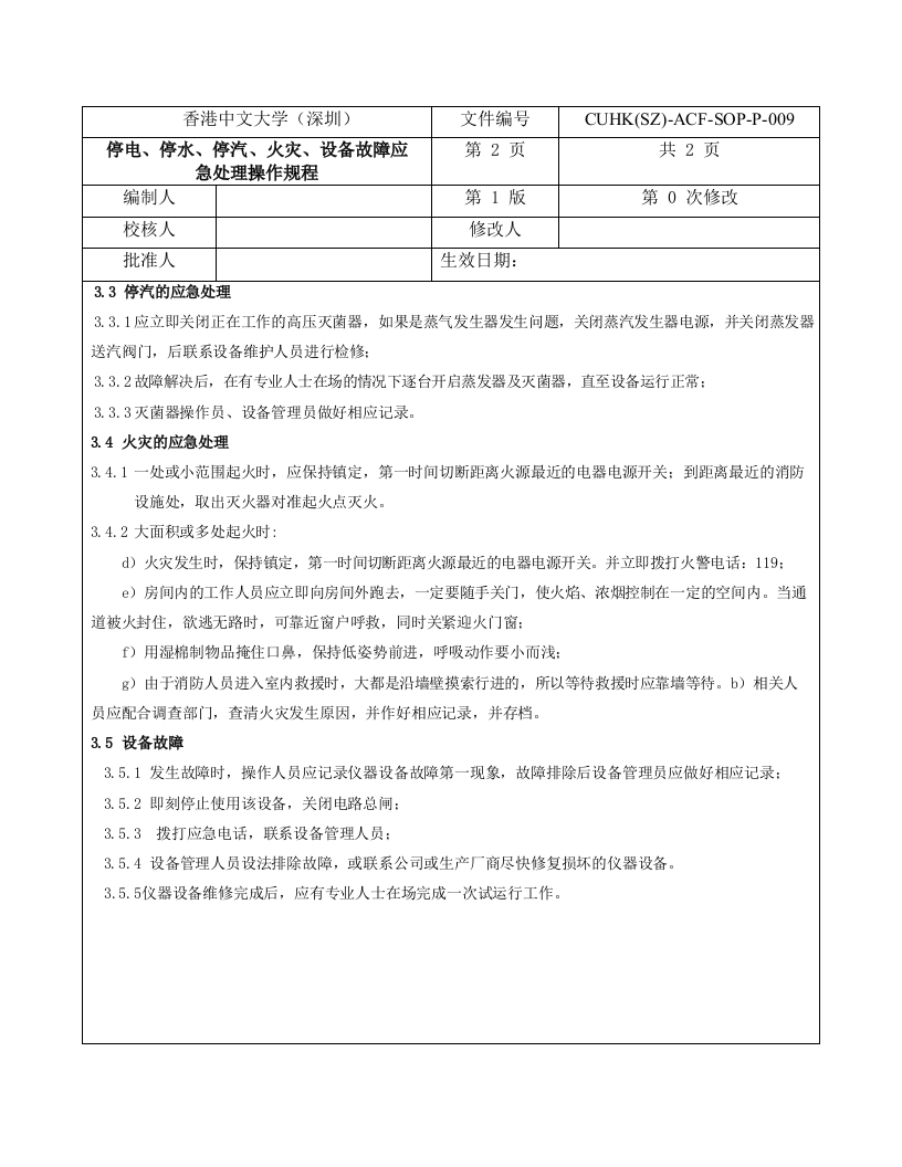 香港中文大学(深圳)文件编号CUHK(SZ)-ACF-SOP-P-009停电、停水、停汽、火灾、设备故障应第1页共2页急处理操作规程编制人第1版第0次修改校核人修改人批准人生效日期:、目的建立标准的停电、停水、停汽、设备故障应急处理操作规程。2、适用范围实验动物中心工作人员及设备维护人员。3、主体内容应急响应:刘雪梅0755235161121 iuxuemei@cuhk.edu.cn3.1停电的应急处理3.1.1照明停电应急处理a)屏障内工作人员,在所处位置原地待命:b)未进入屏障人员禁止进入,在屏障入口张贴告示,并通知相关设备维护人员:c)相关人员在接到通知后,及时检查停电原因,及时排除:3.1.2空调机组及循环水泵停电应急处理:)屏障内工作人员,在所处位置原地待命,并禁止开启各动物房的门:b)未进入屏障人员禁止进入,在屏障入口张贴告示,并通知相关设备维护人员:℃)设备管理、维护人员在接到通知后,立即关闭停电前运行的所有设备,及时检查停电原因并加以处理。供电恢复后,设备按先后顺序,逐个开启。3.1.3如半小时内解决不了,应立即通知屏障内所有人员撤离屏障。并及时向上级领导反映。3.1.4设备管理人员做好相应记录。3.2停水的应急处理3.2.1自来水停水时,应立即启用备用水箱或者供水塔供水,并立即通知设备维护人员或自来水公司。自来水停水时,且无水箱或者供水塔供水,应立即关闭掉正在工作且需要用到自来水的设备,如循环水泵、高压灭菌器及蒸气发生器等:3.2.2待自来水供应正常后逐步开启相关设备。注意设备开启的先后顺序:3.2.3纯水系统因故障导致停水时,应立即停止使用并通知设备维护人员关闭设备电源,联系厂商由专职人员进行维修:3.2.4纯水系统因故障导致屏障内小鼠饮用水短缺,可选择高压灭菌瓶装自来水:3.2.5灭菌器操作员、设备管理员做好相应记录。