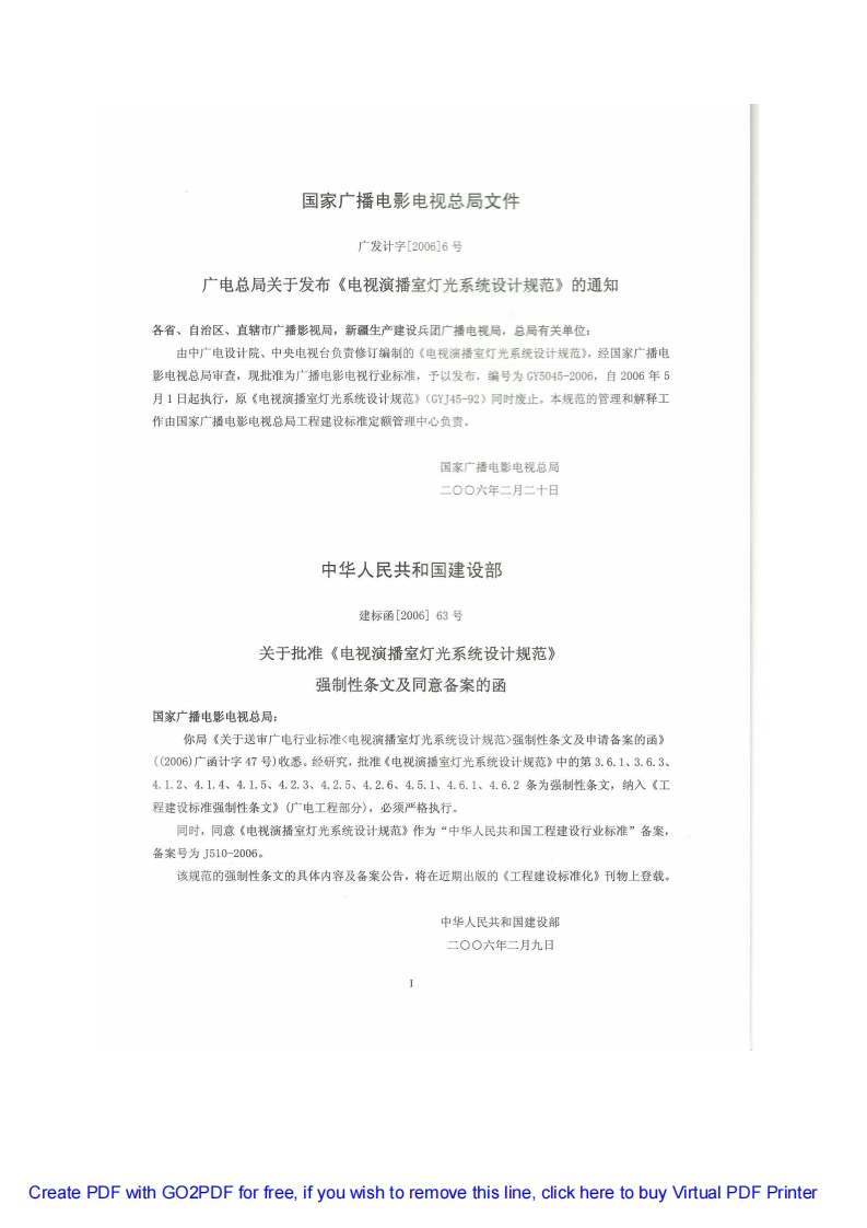 GY中华人民共和国广播电影电视工程建设行业标准GY5045-2006备案号:J510-2006电视演播室灯光系统设计规范Code for design of TV studio lighting system2006-02-20发布2006-05-01实施国家广播电影电视总局发布Create PDF with GO2PDF for free,if you wish to remove this line,click here to buy Virtual PDF Printer